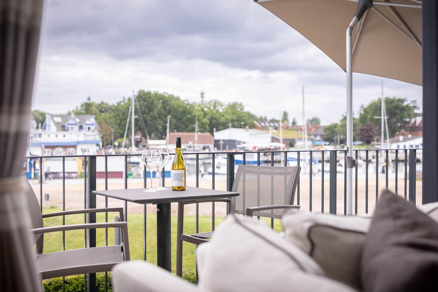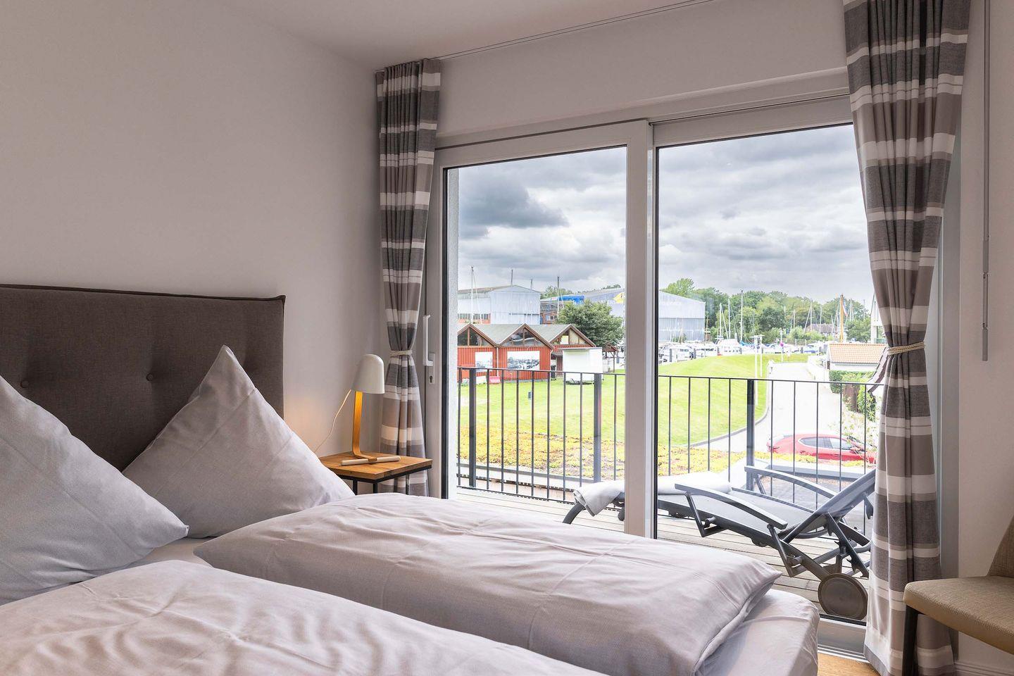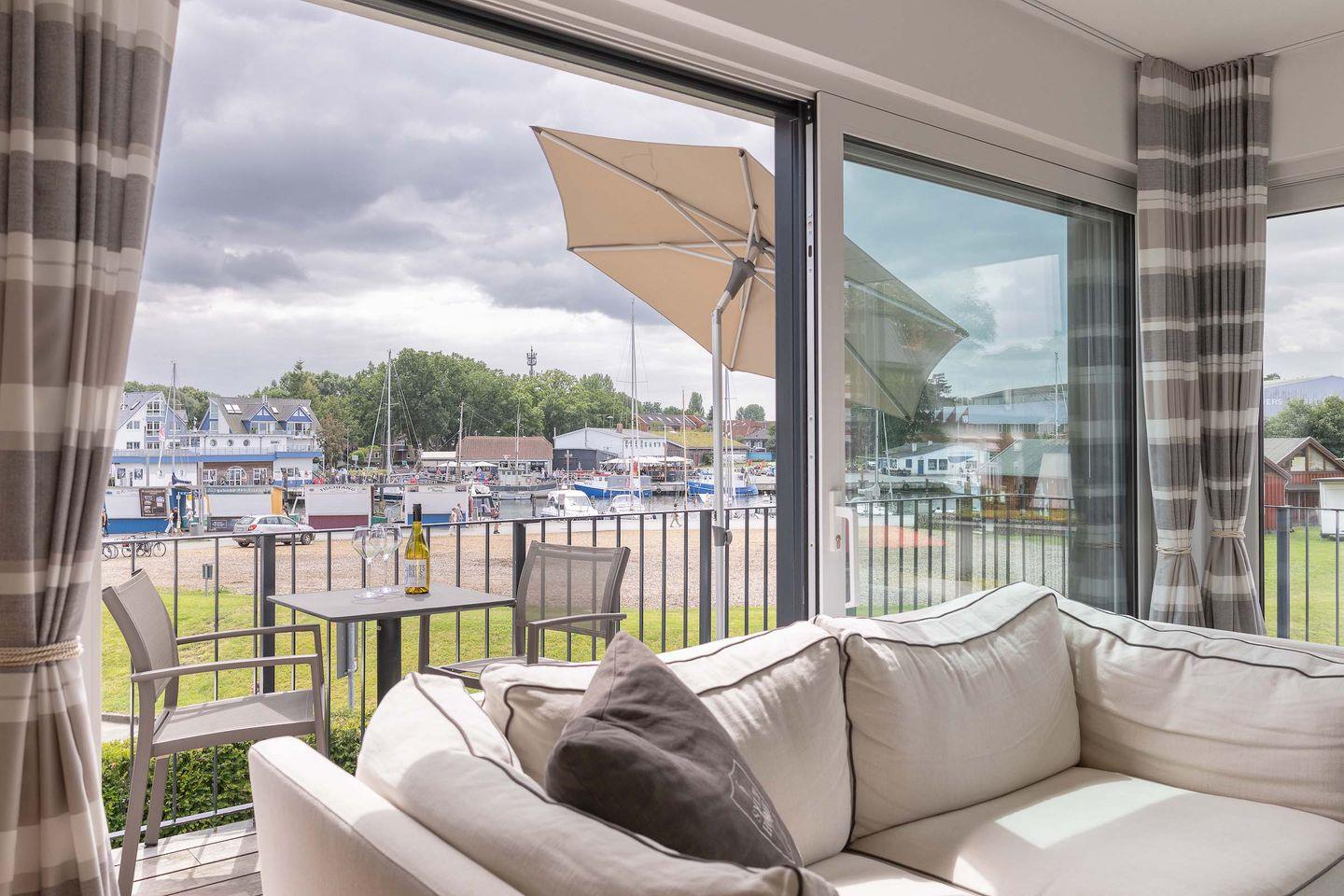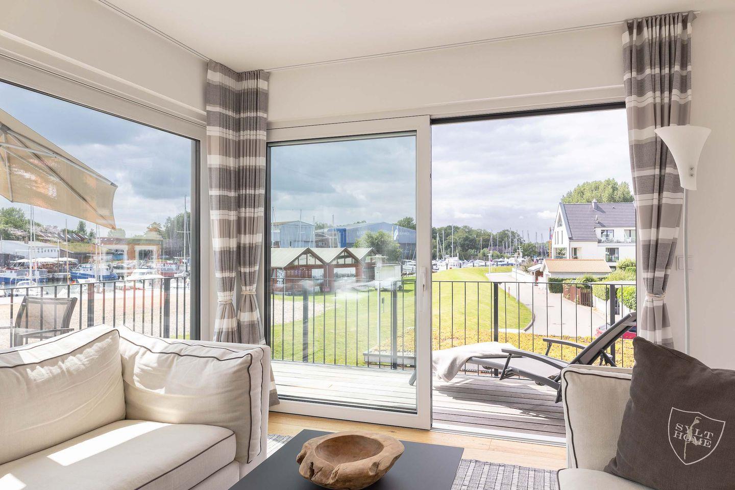 Die exklusive Wohnung im ersten Obergeschoss eines modernen Neubaus bietet auf 80?m² Platz für bis zu vier Personen. Zwei stilvolle Schlafzimmer, ein elegantes Badezimmer und ein großzügiger Wohnbereich schaffen Raum für Erholung auf höchstem Niveau. Bodentiefe Fenster eröffnen den beeindruckenden Hafenblick, während von einem der Schlafzimmer auch die Ostsee sichtbar ist. Der weitläufige Balkon lädt dazu ein, viele Sonnenstunden und unvergessliche Sonnenuntergänge in exklusiver Atmosphäre zu genießen.