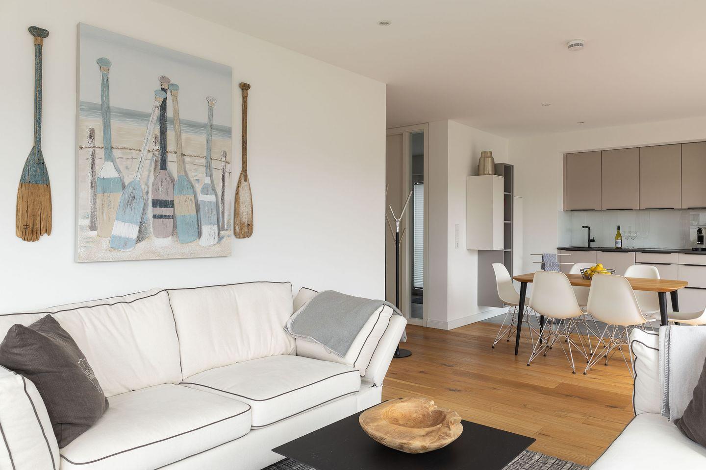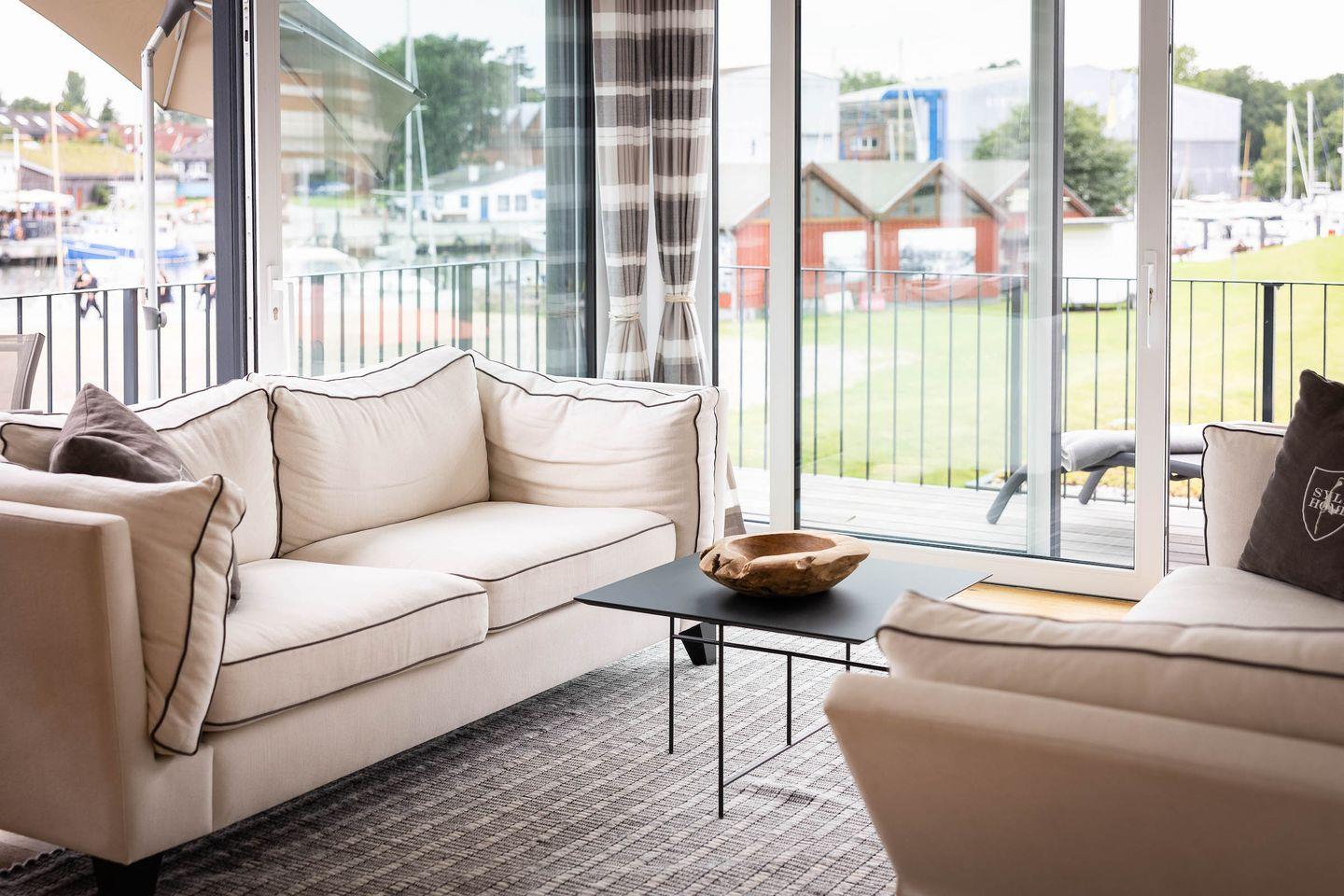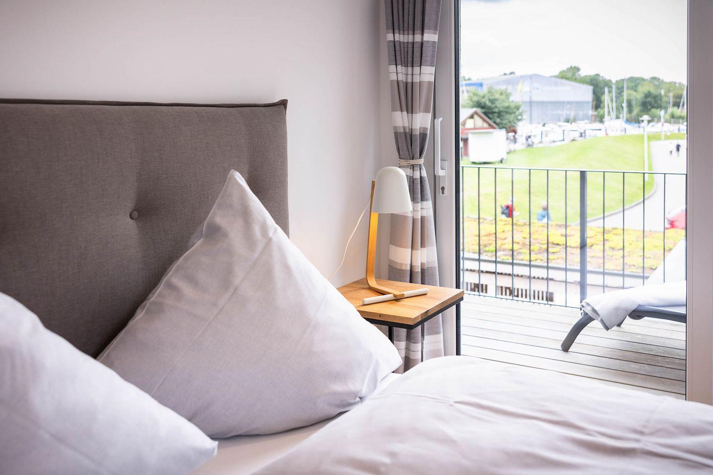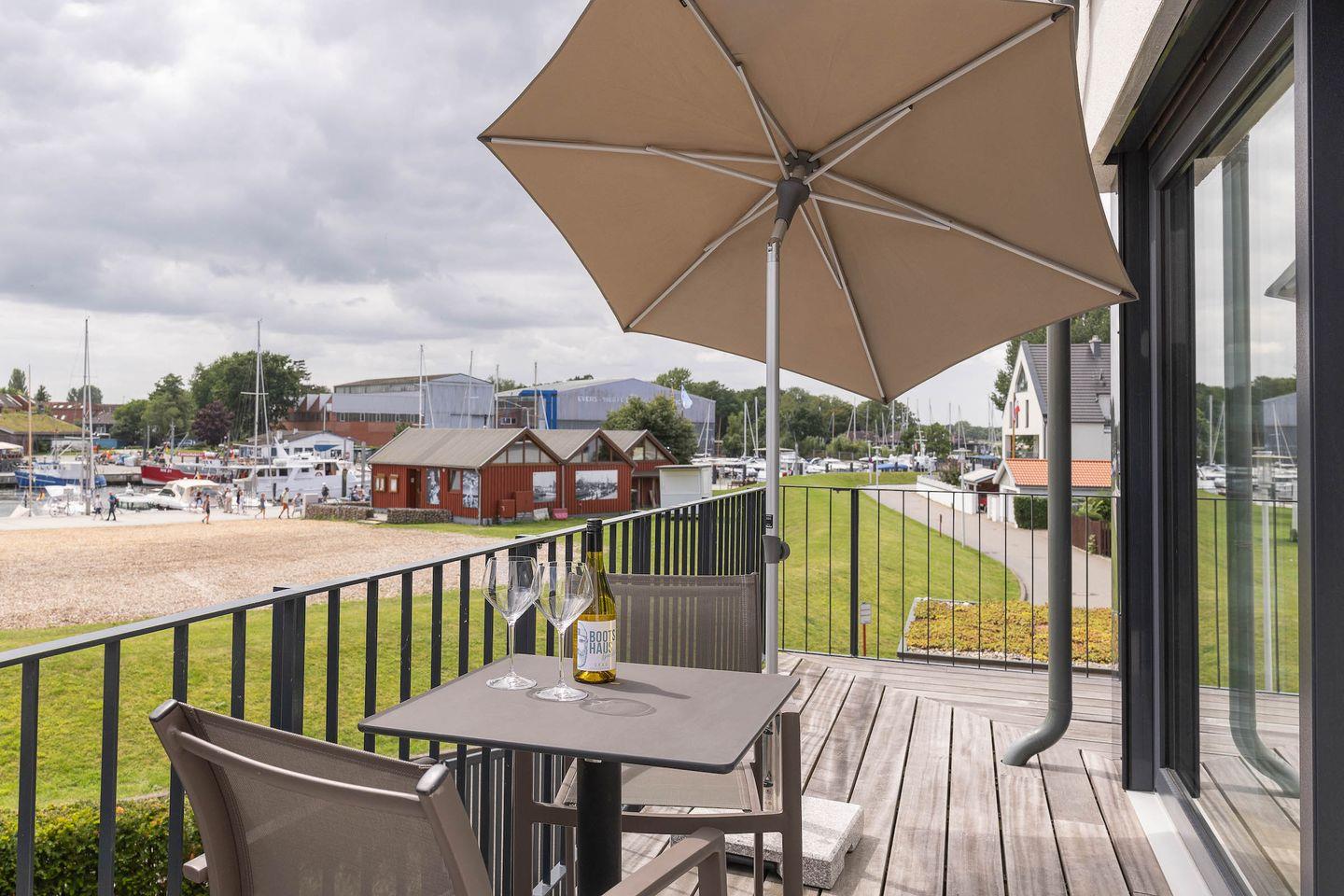 Die exklusive Wohnung im ersten Obergeschoss eines modernen Neubaus bietet auf 80?m² Platz für bis zu vier Personen. Zwei stilvolle Schlafzimmer, ein elegantes Badezimmer und ein großzügiger Wohnbereich schaffen Raum für Erholung auf höchstem Niveau. Bodentiefe Fenster eröffnen den beeindruckenden Hafenblick, während von einem der Schlafzimmer auch die Ostsee sichtbar ist. Der weitläufige Balkon lädt dazu ein, viele Sonnenstunden und unvergessliche Sonnenuntergänge in exklusiver Atmosphäre zu genießen.