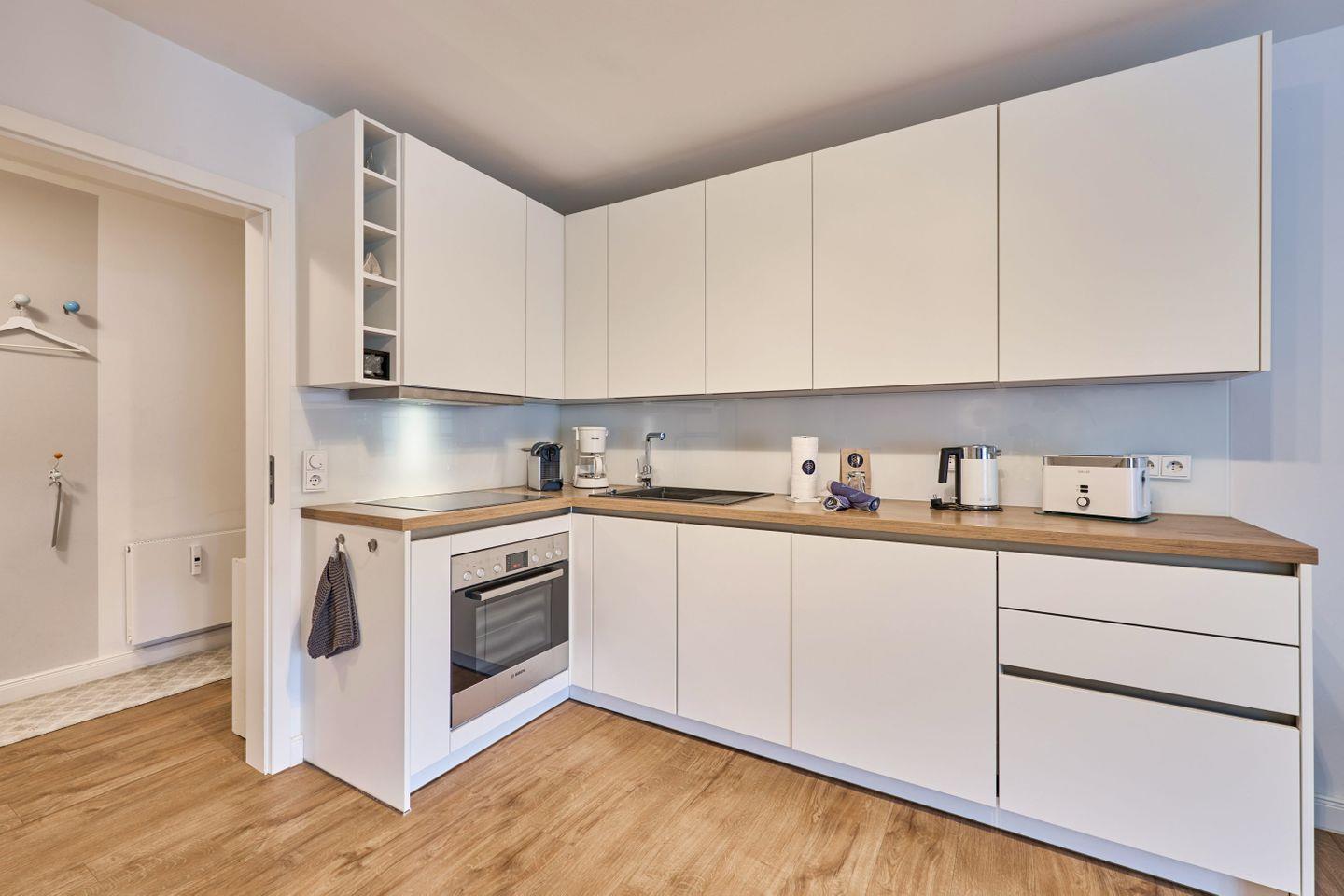 Küchenutensilien ausgestattet, darunter ein Ceranfeld, ein Backofen und ein Geschirrspüler.