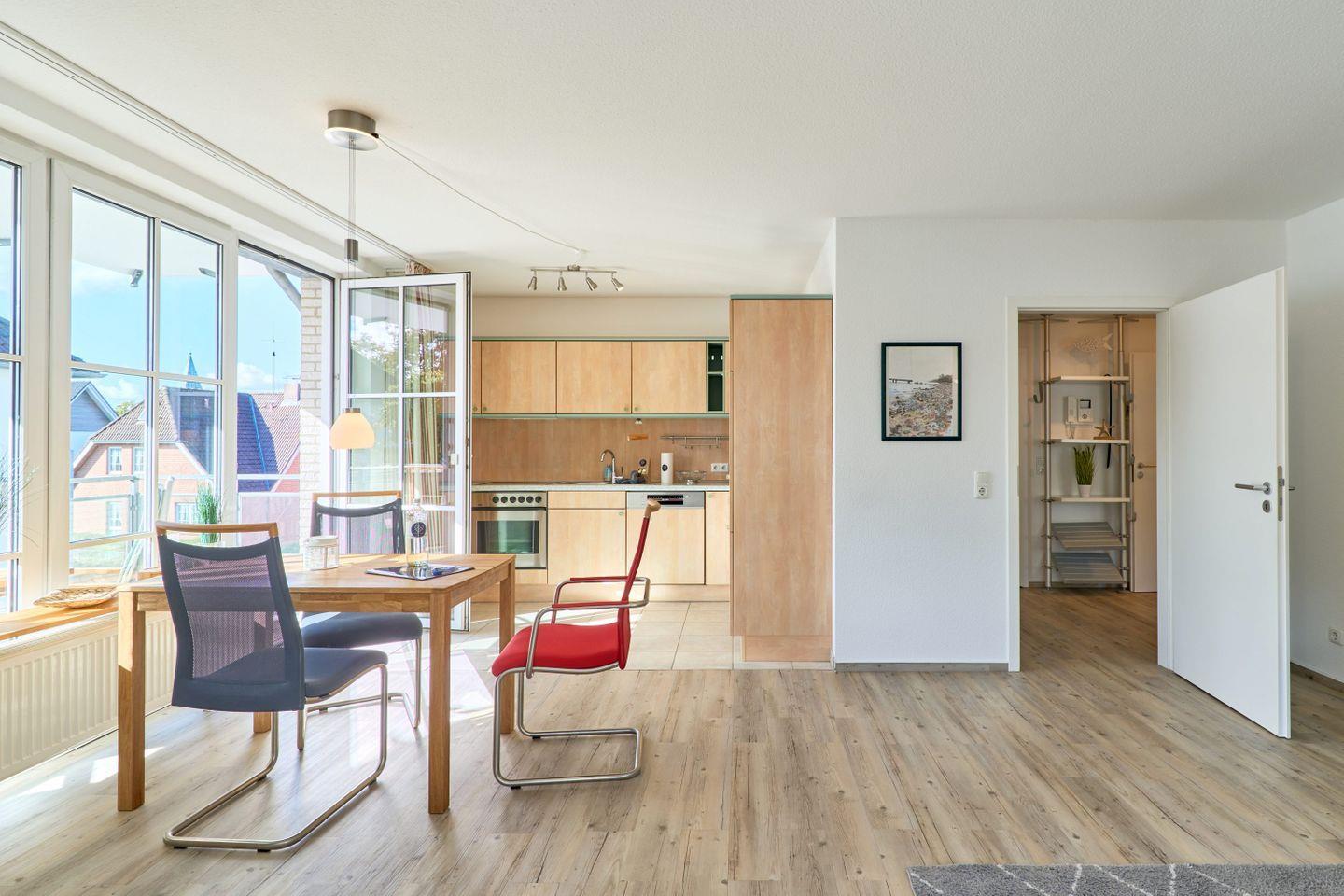 Das 60 m² große 2-Zimmer-Apartment in der ersten Etage bietet Platz für bis zu 2 Personen und ist modern und geschmackvoll eingerichtet. Der Wohnbereich verfügt über ein komfortables Sofa, einen bequemen Fernsehsessel mit Hocker für entspannte Fernsehabende, sowie einen Flatscreen-TV und eine gut ausgestattete Küche mit Essbereich.