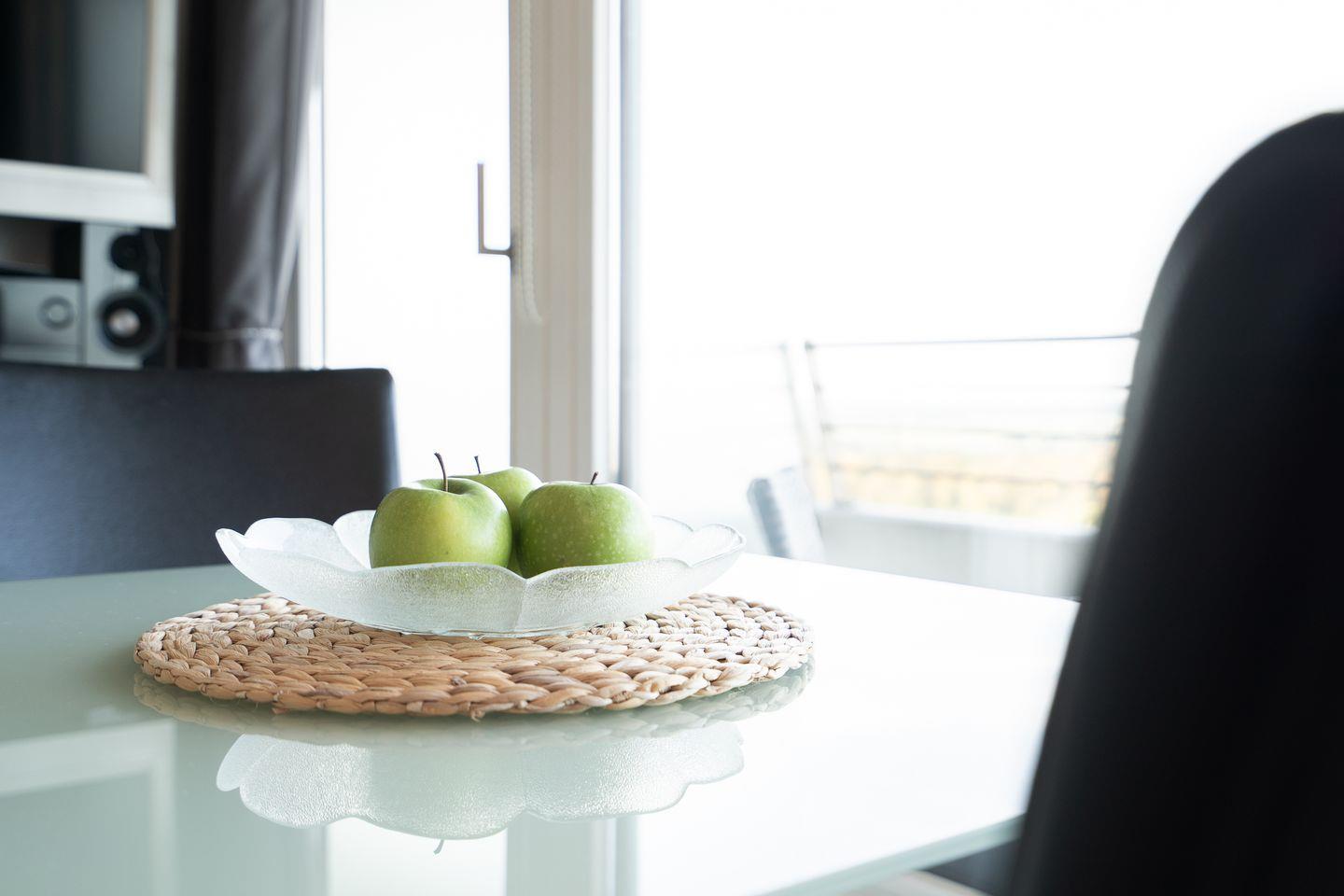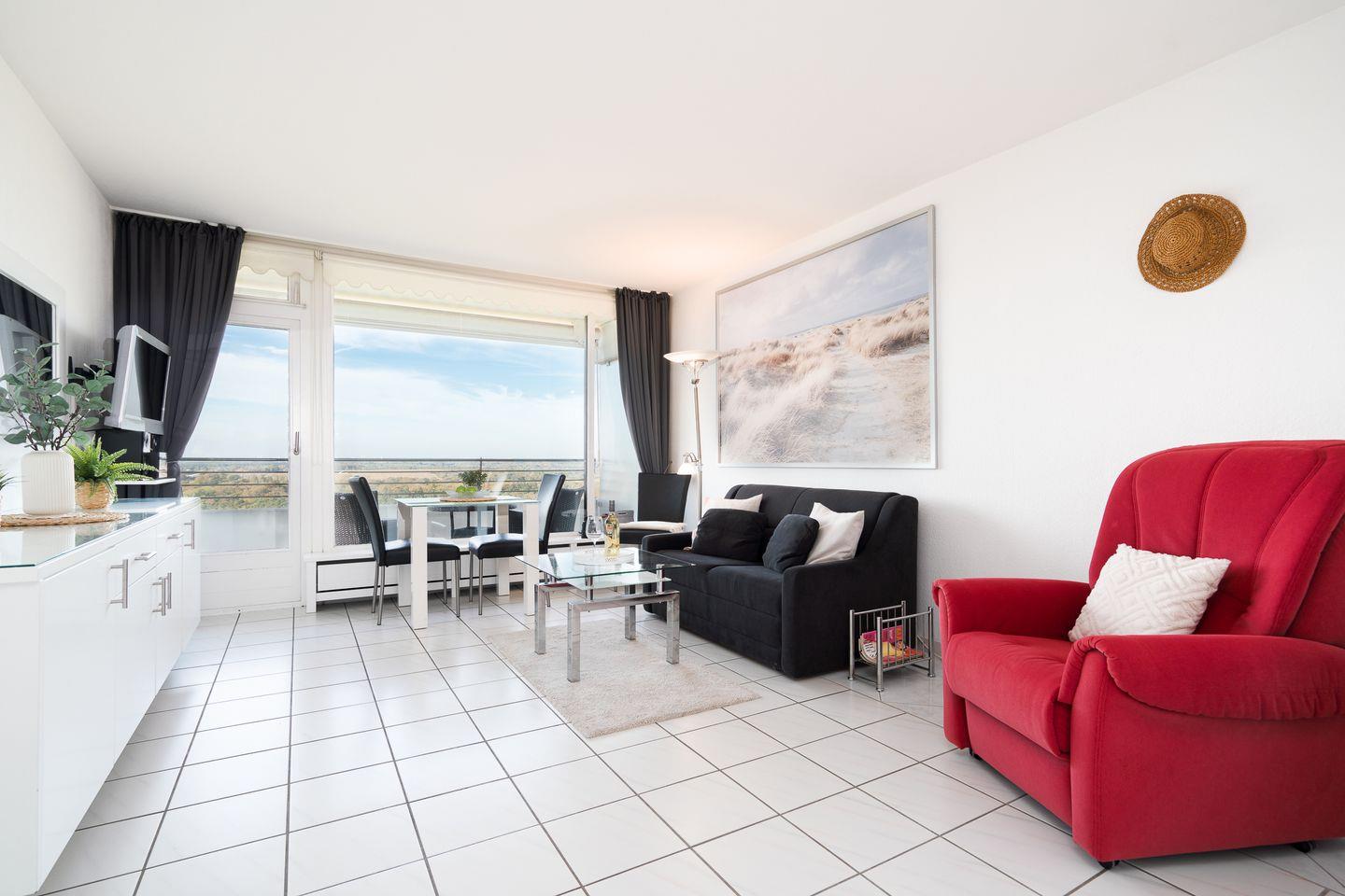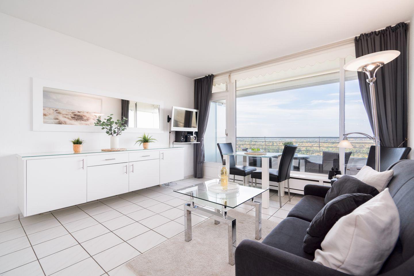 Der helle und geräumige Wohnbereich verfügt über ein gemütliches, ausziehbares Sofa mit Blick auf den Flat-TV sowie den Essbereich mit Sitzmöglichkeiten für bis zu 3 Personen. Von dort aus betreten Sie den möblierten West-Balkon, von dem aus Sie einen traumhaften Blick über die Wälder bis hin zur Ostsee genießen können.
