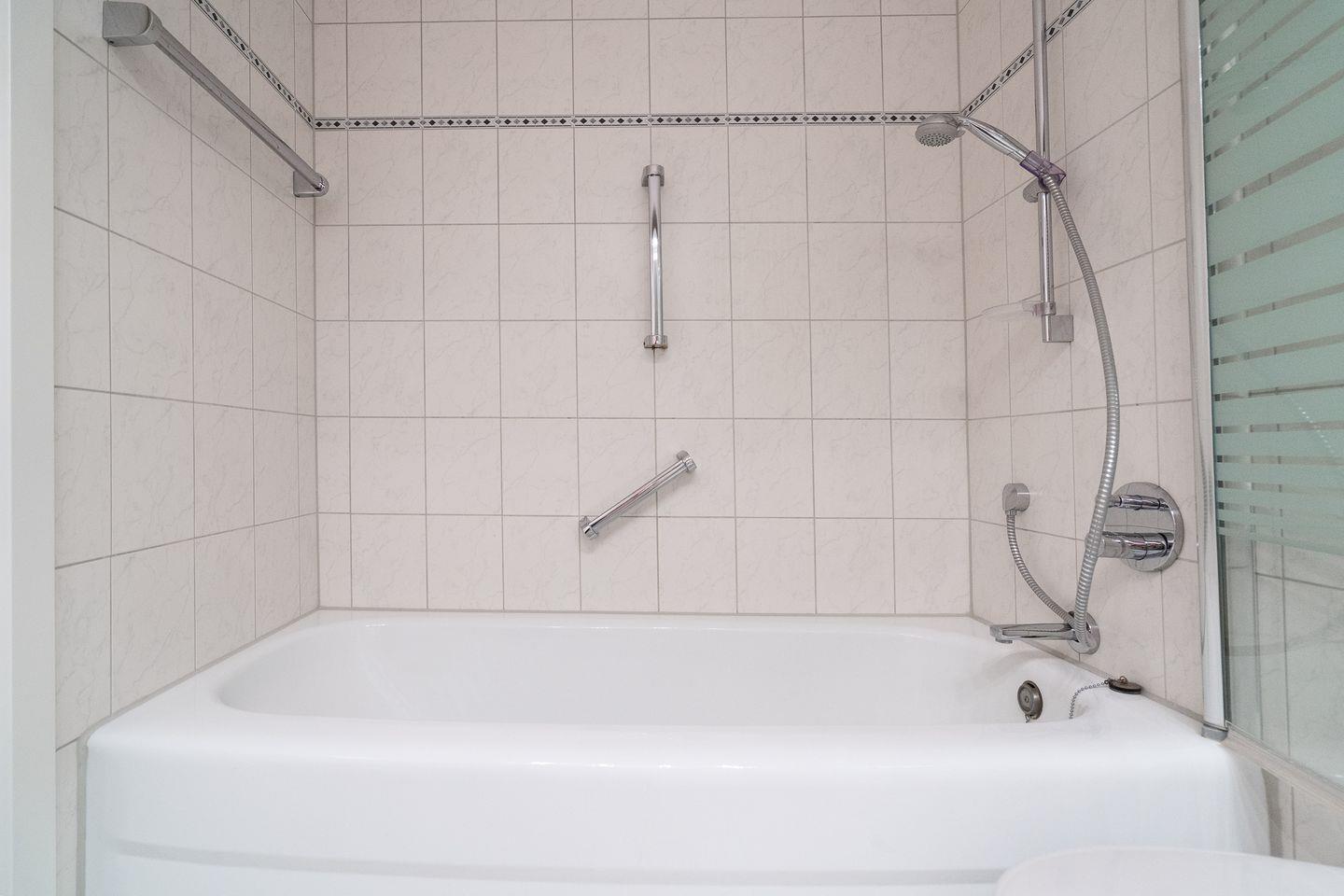 Das Badezimmer verfügt über eine Badewanne mit Glasduschabtrennung.
