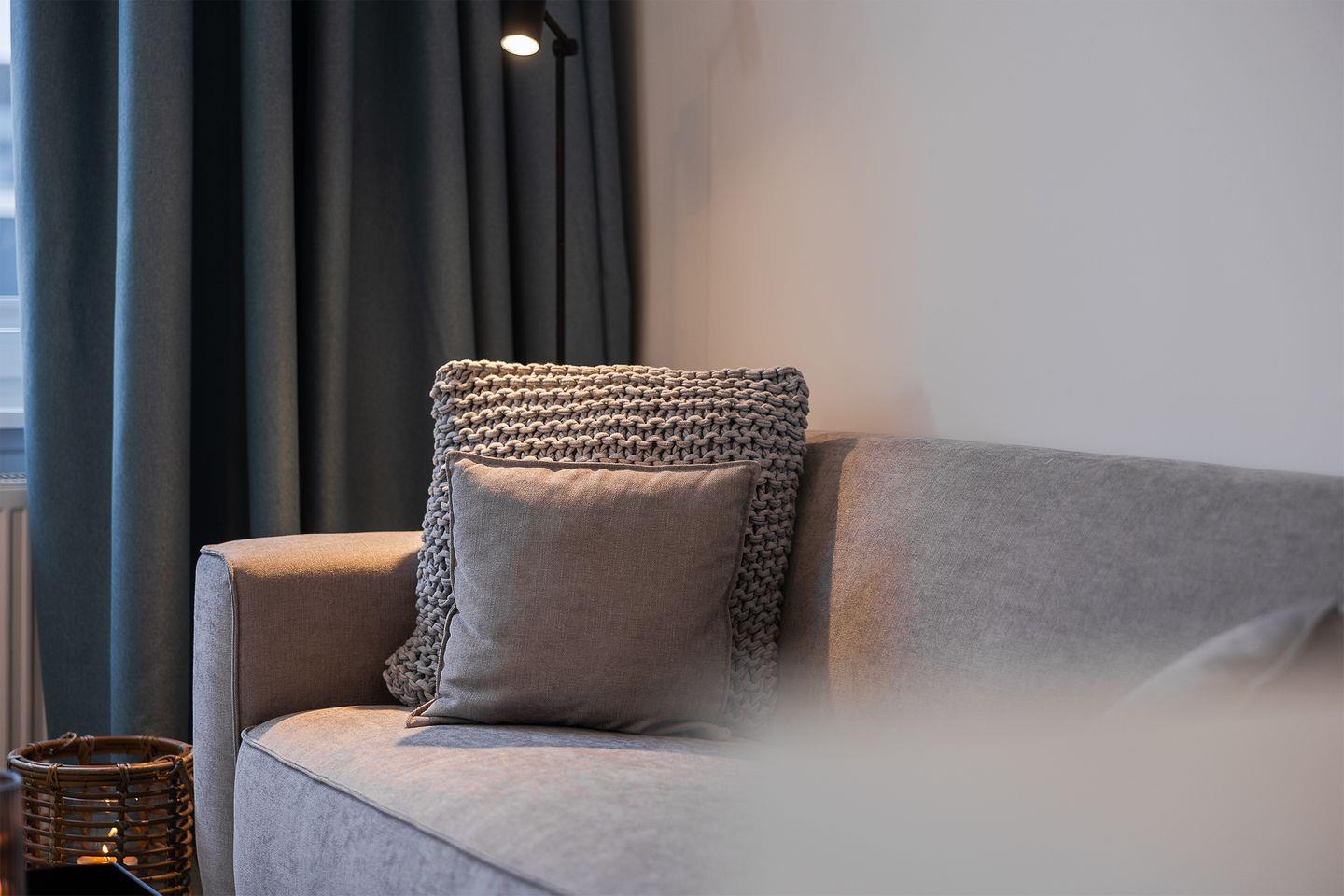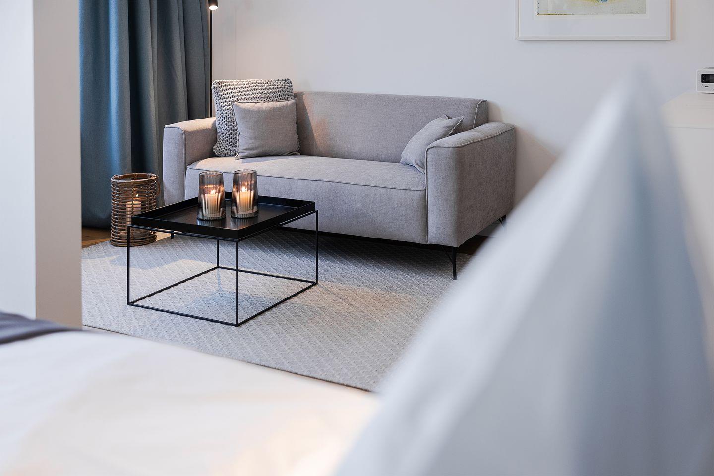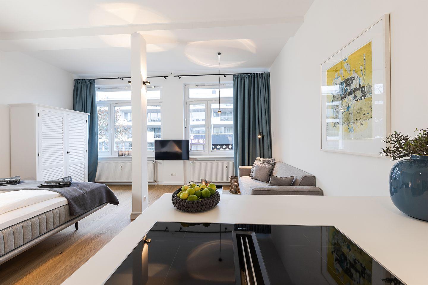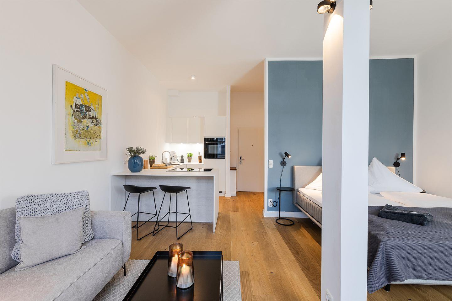 Die Ferienwohnung überzeugt mit einem hellen, offen gestalteten Wohn- und Schlafbereich. Ein komfortables Boxspringbett sorgt für erholsamen Schlaf, und aus dem Wohnzimmer erhaschen Sie sogar einen kleinen Blick auf die Ostsee – für die Extraportion Urlaubsgefühl.