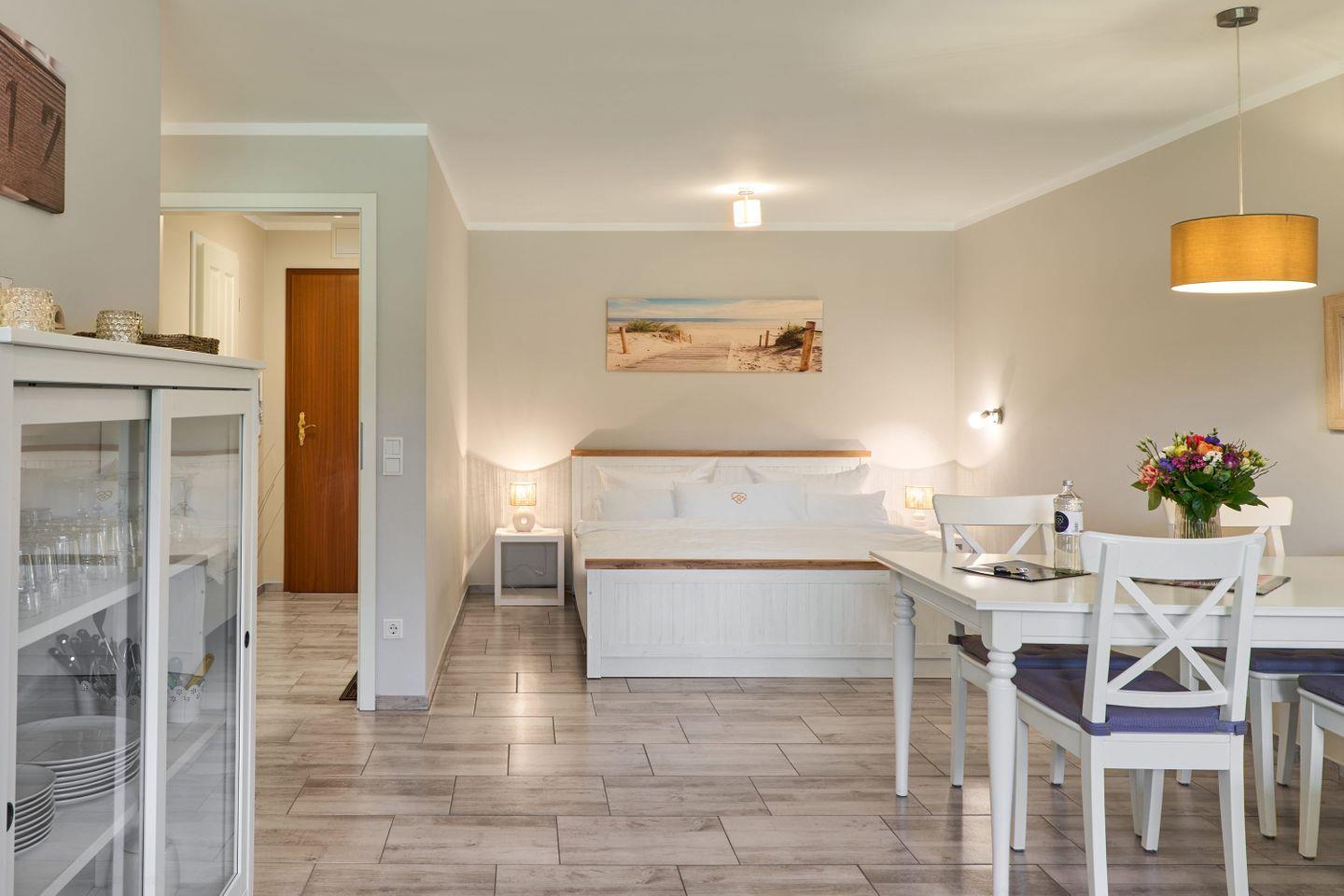 Die stilvolle 2-Zimmer-Wohnung für bis zu 3 Personen liegt zentral, nur wenige Gehminuten vom Strand und der Fußgängerzone entfernt. Im Sommer sorgt die Souterrain-Lage für angenehme Kühle. Der Wohn-Schlafbereich bietet ein komfortables Doppelbett, das zweite Zimmer ein Einzelbett, TV und Kleiderschrank. Eine voll ausgestattete Küche, ein modernes Duschbad und ein privater PKW-Stellplatz runden das Angebot ab.
