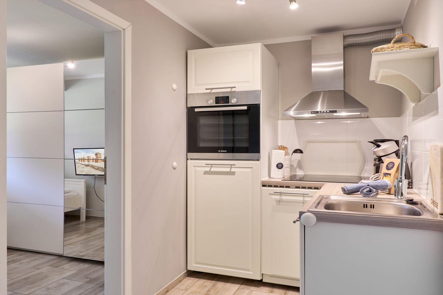 Der Wohn-Schlafbereich ist mit einem komfortablen Doppelbett ausgestattet und lädt zum Entspannen ein. Das zweite Zimmer verfügt über ein Einzelbett, einen TV und einen Kleiderschrank – ideal für eine dritte Person oder als Rückzugsort. Die voll ausgestattete Küche bietet alles für die Selbstverpflegung, während das moderne Duschbadezimmer für Komfort sorgt.