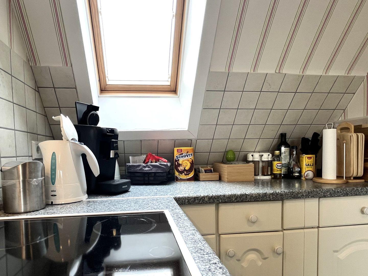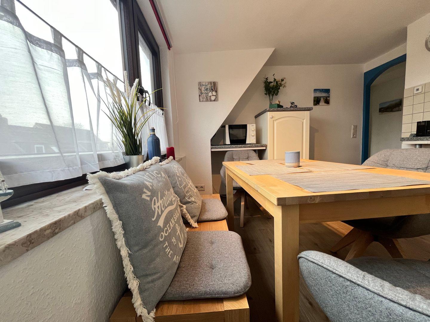 Der offene Wohnbereich mit integrierter Küche ist der Herzstück dieser Unterkunft. Hier finden Sie eine moderne Ausstattung, die keine Wünsche offenlässt. Die Küche ist mit einem Herd, Backofen, Kühlschrank sowie allen notwendigen Küchenutensilien ausgestattet. Auch eine Mikrowelle, eine Kaffeemaschine sowie Toaster und Wasserkocher stehen Ihnen zur Verfügung. Nach einem langen Tag können Sie sich hier am Esstisch gemeinsam stärken oder auf der bequemen Sofaecke entspannen und Ihre Lieblingssendungen auf dem großen digitalen Fernseher (35-44 Zoll) genießen. WLAN und Internetzugang sind ebenfalls vorhanden, sodass Sie auch im Urlaub stets verbunden bleiben.