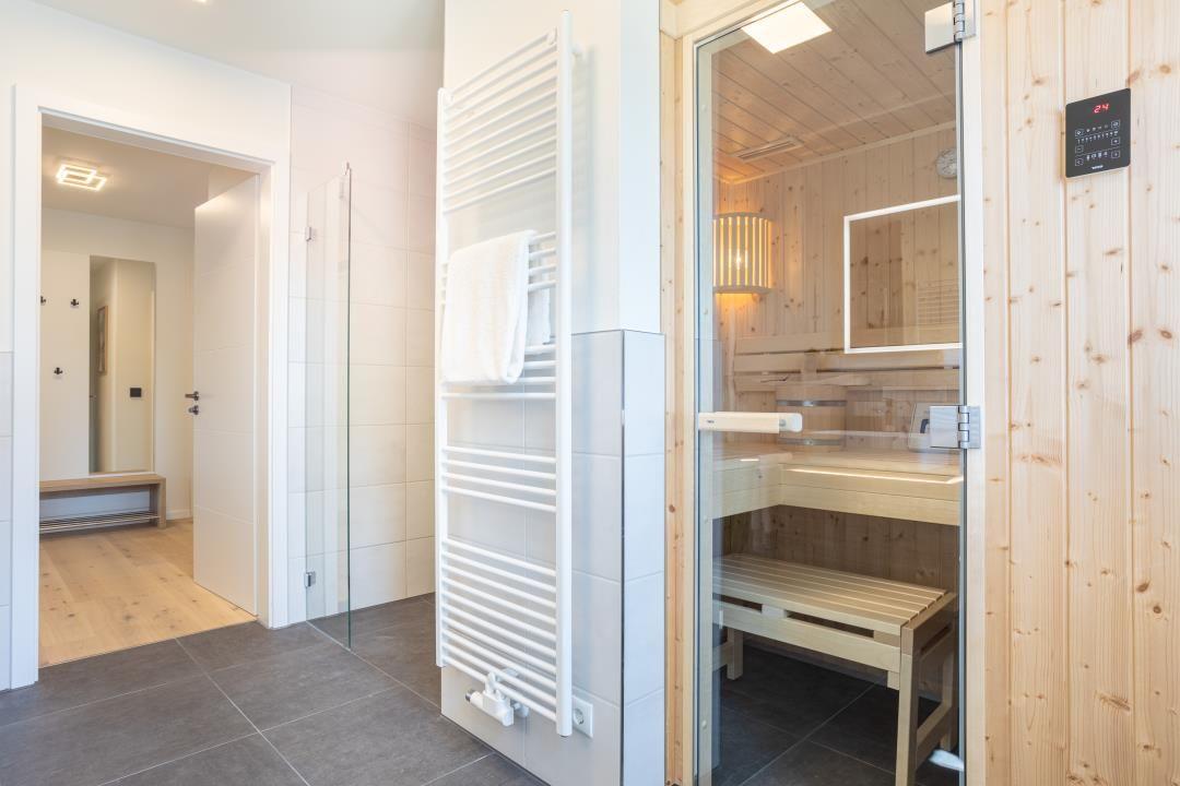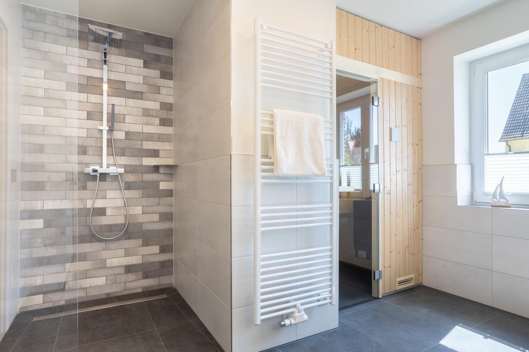 Das moderne Badezimmer überzeugt mit einer bodengleichen Dusche, einer Sauna, Handtuchheizung und viel Platz. Ein Haartrockner sowie ausreichend Ablagefläche runden den Komfort ab.