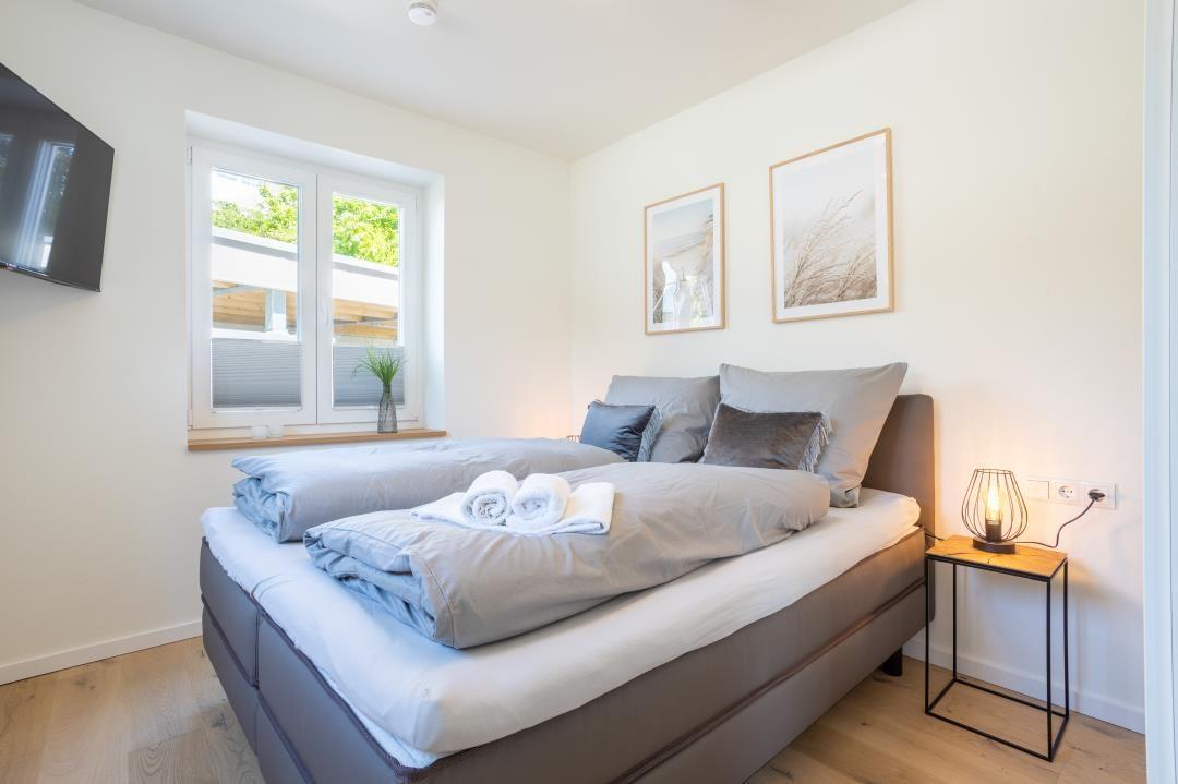 Zwei separate Schlafzimmer bieten Ruhe und Komfort: Das Hauptschlafzimmer ist mit einem komfortablen Doppelbett ausgestattet, das zweite Zimmer verfügt ebenfalls über ein Doppelbett – ideal für Familien oder gemeinsam reisende Paare.