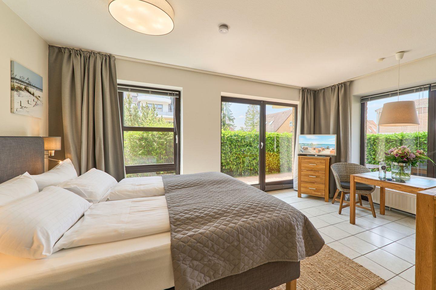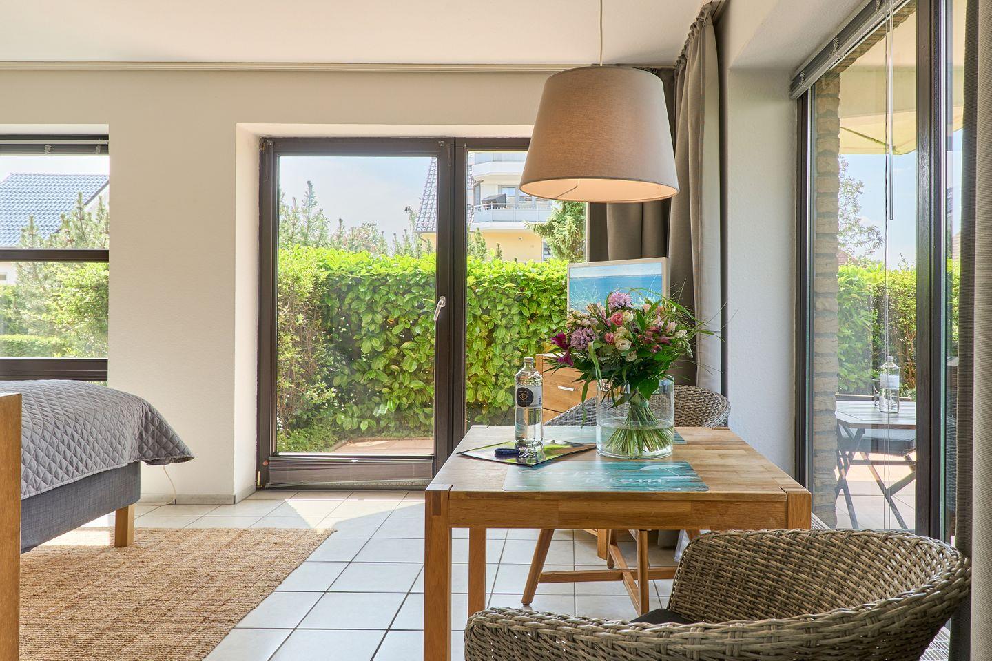 Der helle und modern gestaltete Wohnschlafbereich lädt zum Verweilen und Wohlfühlen ein. Große Fenster sorgen für viel Tageslicht und schaffen eine angenehme Verbindung zur angrenzenden sonnigen Terrasse, die mit Gartenmöbeln ausgestattet ist. Hier können Sie den Tag ganz entspannt mit einem Frühstück im Freien beginnen oder laue Sommerabende bei einem Glas Wein ausklingen lassen.