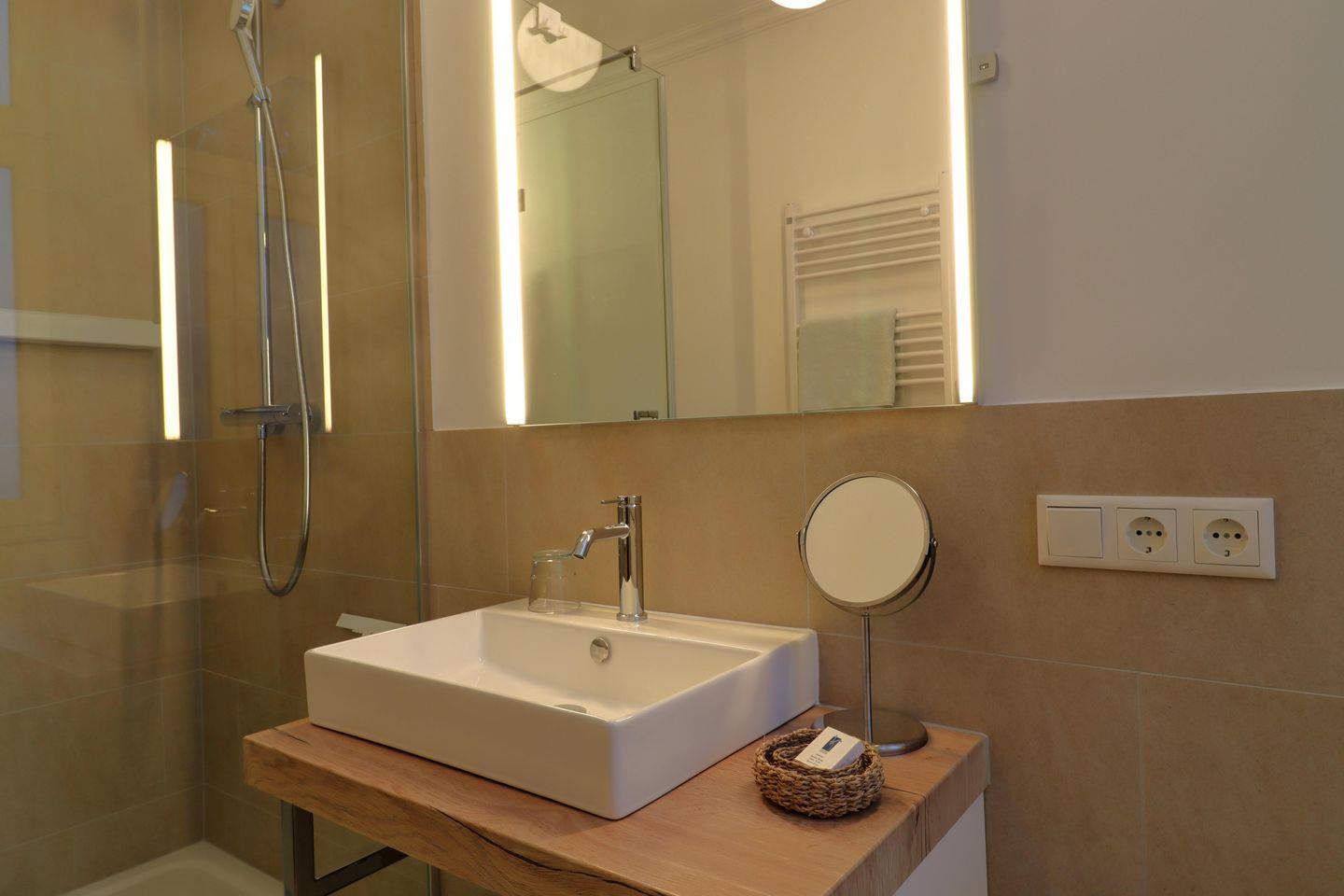 Das neue, großzügige Badezimmer ist mit moderner Walk-in-Dusche, WC und Föhn ausgestattet.