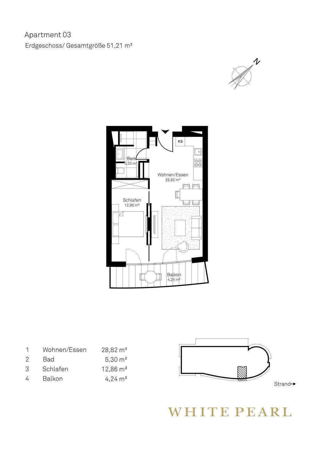 Das schöne Luxusapartment 0.03 befindet sich im Erdgeschoss des "White Pearl" und bietet Platz für 4 Personen auf 51 m² mit einem offenen Schlafzimmer und einer Schlafcouch im Wohnbereich.