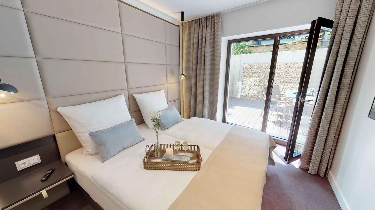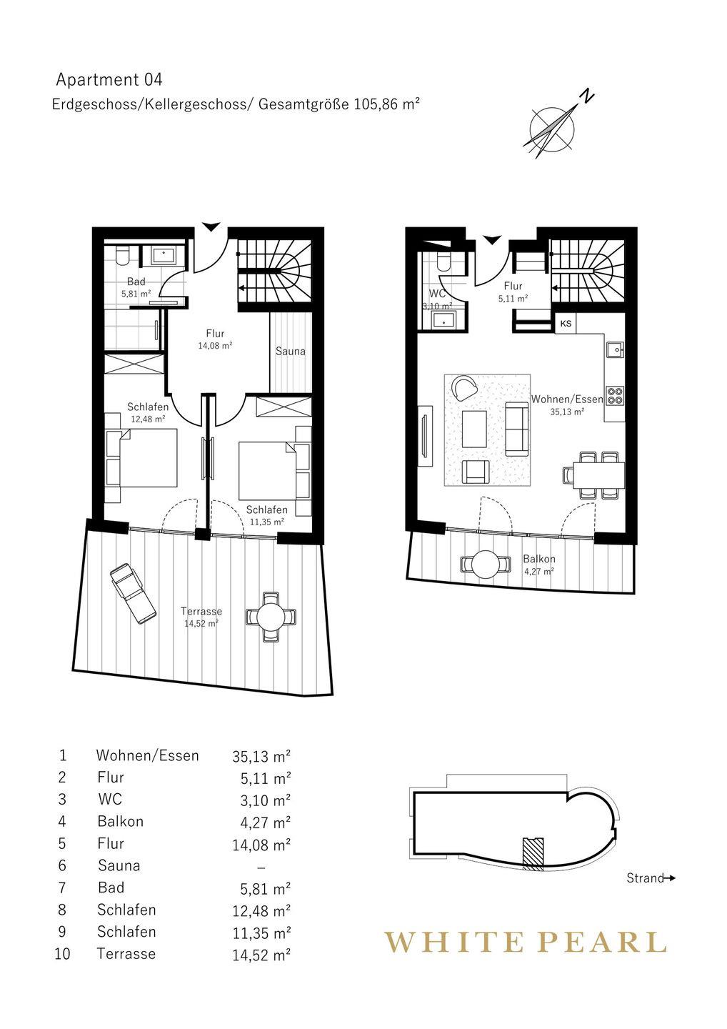Die großzügige Luxussuite 0.04 im Erdgeschoss des "White Pearl" erstreckt sich über zwei Etagen und bietet Platz für 5 Personen auf 106 m² - auch Ihr Hund ist willkommen.