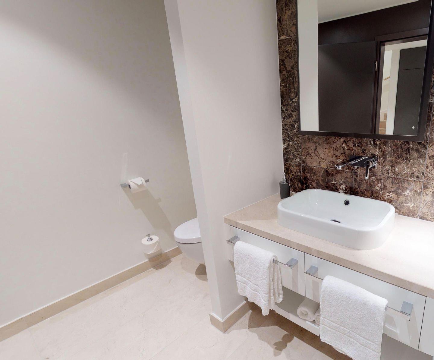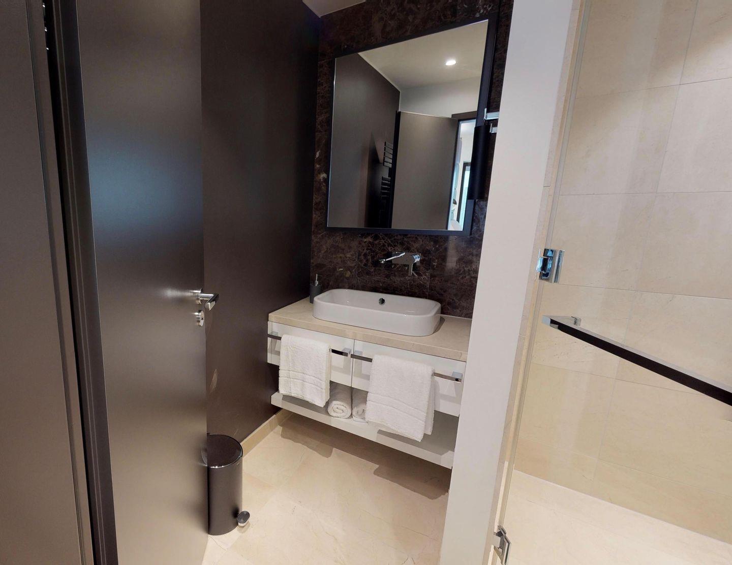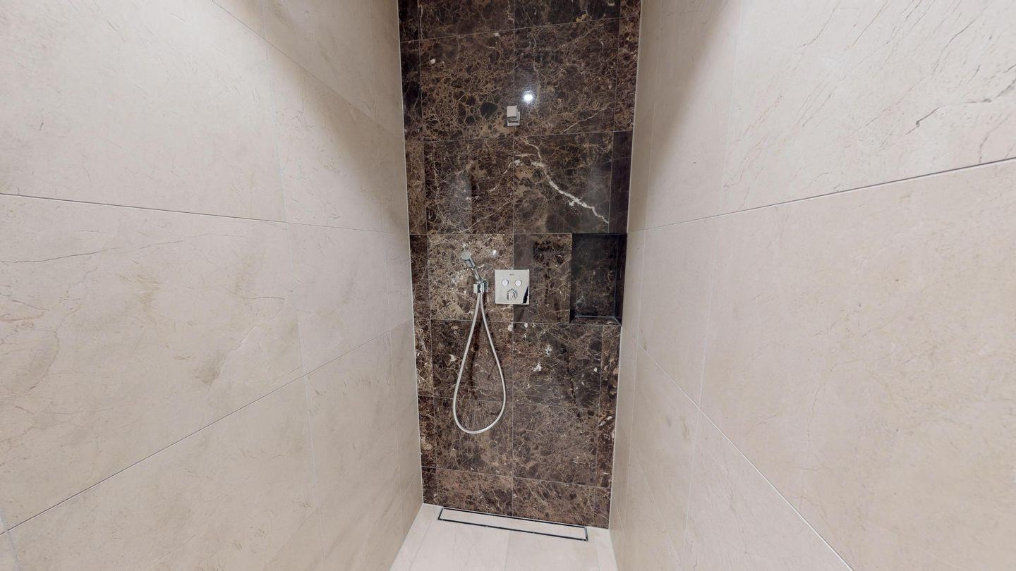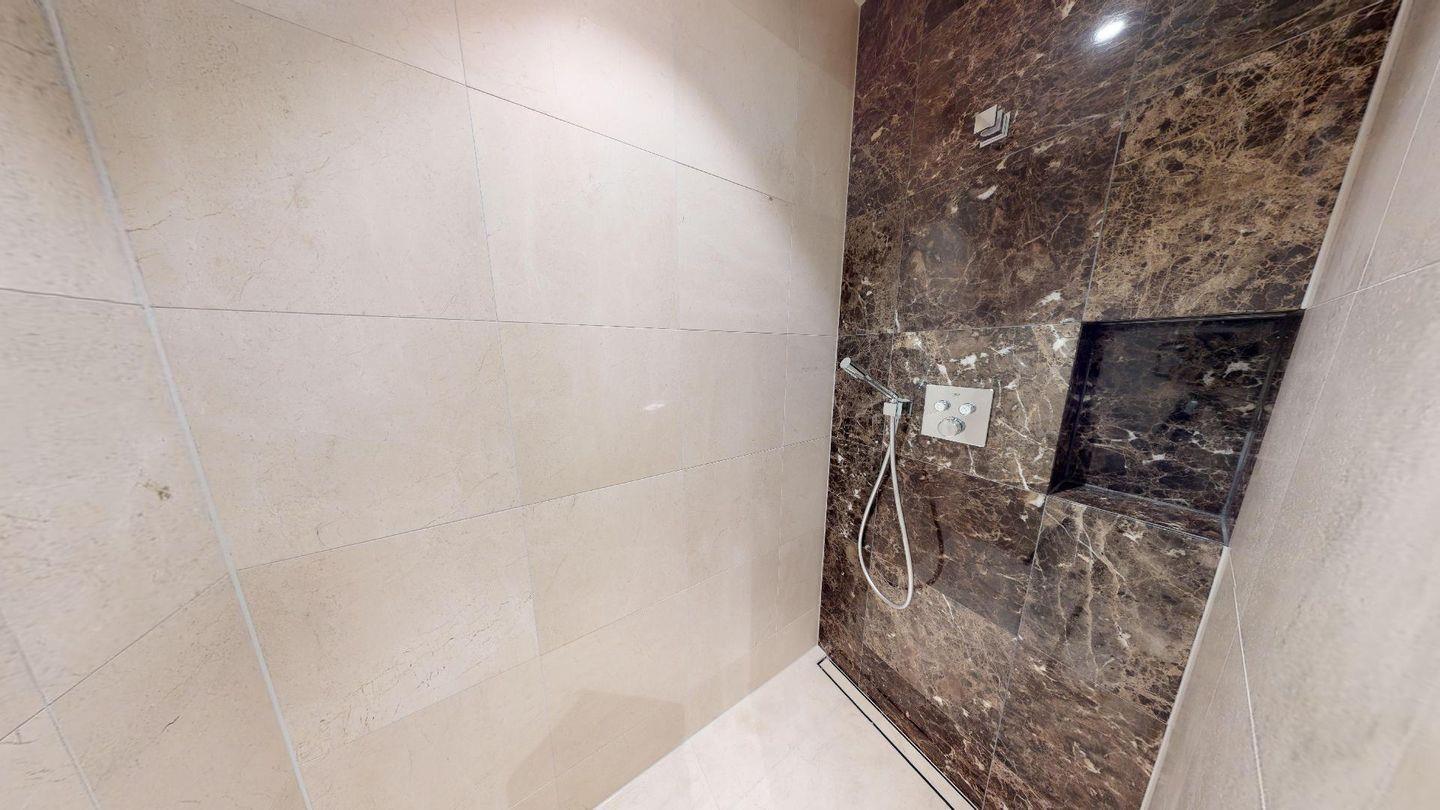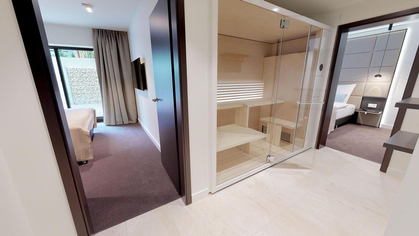 Im Untergeschoss befinden sich zwei Schlafzimmer mit Boxspring-Doppelbetten, wobei eines der Schlafzimmer ein eigenes Bad mit Dusche hat. Beide Schlafzimmer haben Zugang zur großen, möblierten Terrasse. Zusätzlich gibt es im Untergeschoss ein separates Badezimmer mit Dusche sowie eine eigene Sauna (2,37m × 1,19m).