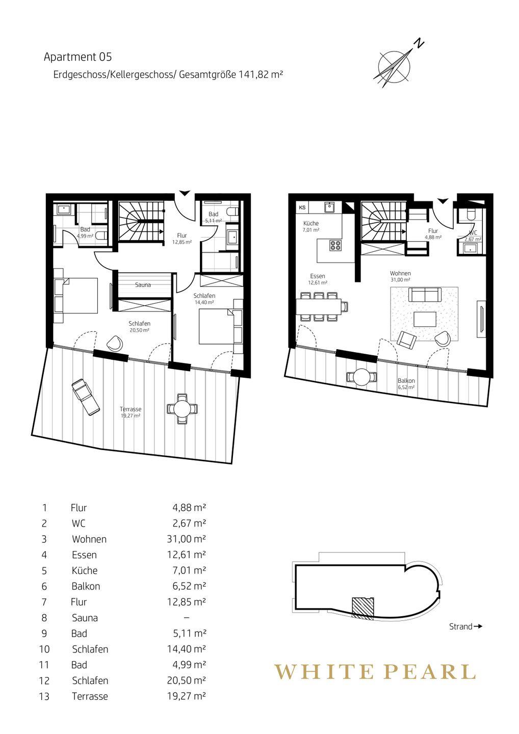 Ein Highlight der Wohnung ist der möblierte Balkon, der entspannte Stunden an der frischen Meeresluft ermöglicht! Zur Wohnung gehört ein Tiefgaragenstellplatz, den Sie direkt vom Flur im Untergeschoss erreichen können.