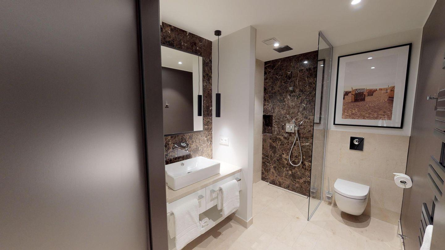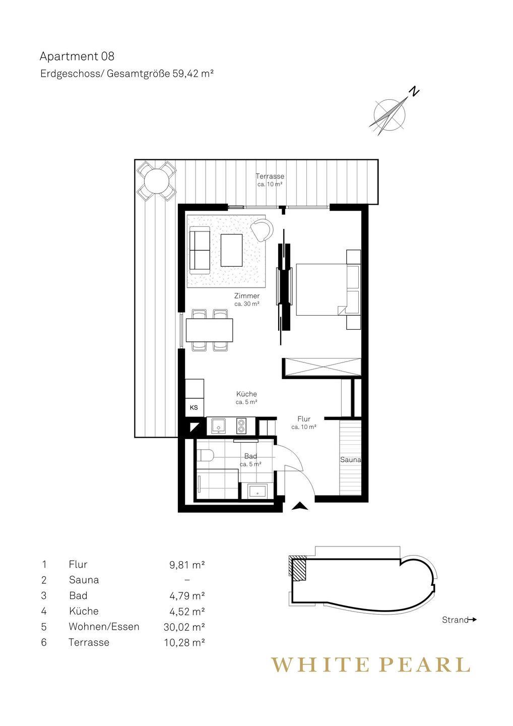 Das helle Luxusapartment 0.08 befindet sich im Erdgeschoss im hinteren Teil des "White Pearl" in Richtung Wald und verfügt über 59 m². Es ist für eine Belegung mit bis zu 4 Personen ausgestattet.