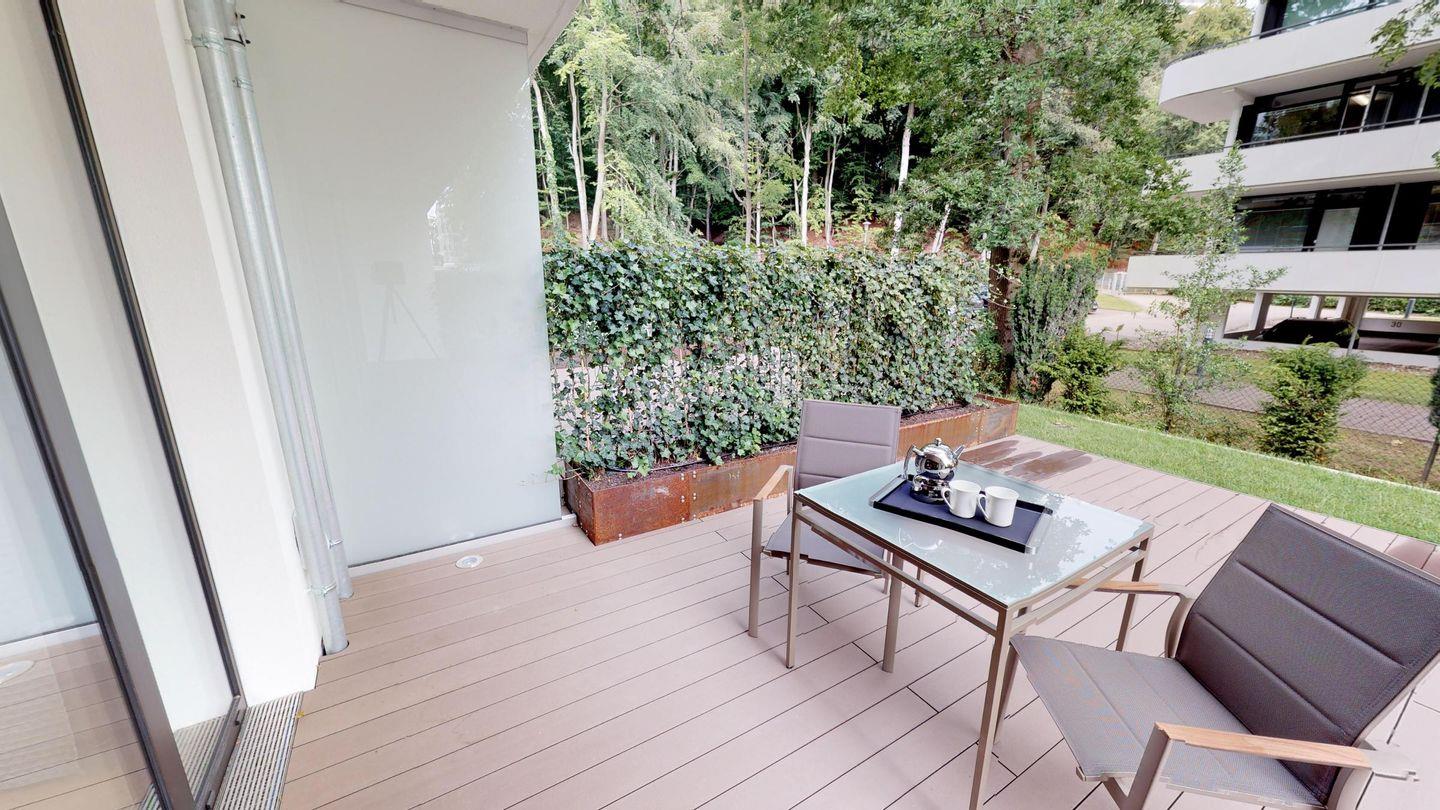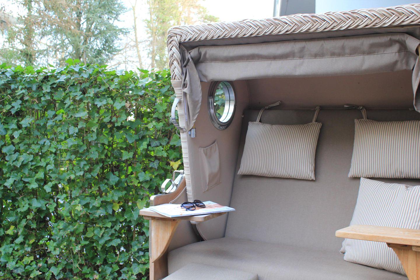 Luxusapartment 0.11 mit Sauna, Strandkorb, Liegen und großer Terrasse.