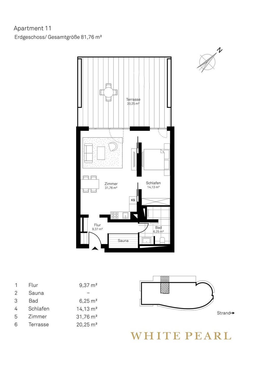 Die Highlights des Apartments sind die eigene Sauna (2,37m x 1,19m) sowie die teilüberdachte, möblierte Terrasse mit einem Strandkorb, die entspannte Stunden an der Meeresluft ermöglicht! Zur Wohnung gehört ein Außenstellplatz.