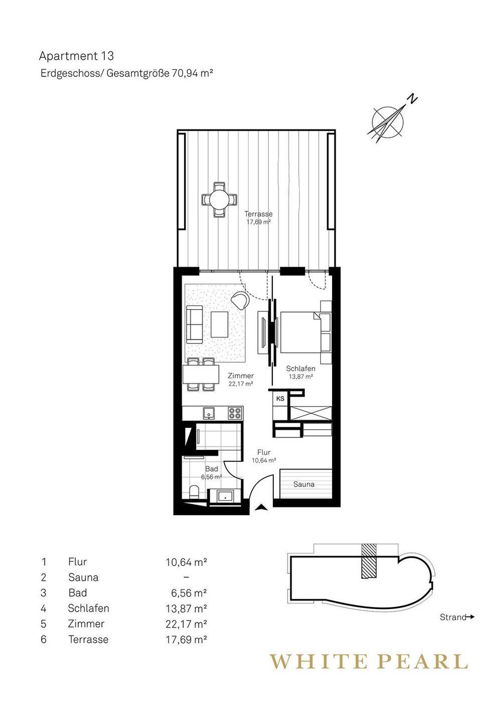 Die Highlights des Apartments sind die eigene Sauna (2,37m x 1,19m) sowie die möblierte Terrasse mit einem Strandkorb, die entspannte Stunden an der Meeresluft ermöglicht! Zur Wohnung gehört ein Außenstellplatz.