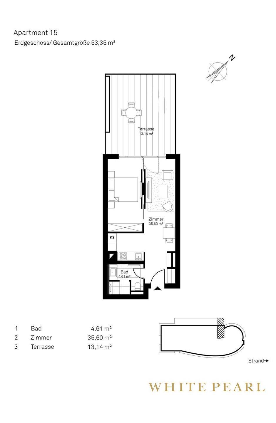 Nur wenige Minuten vom Strand entfernt befindet sich das Luxusapartment 0.15 im Erdgeschoss des "White Pearl" und bietet auf 53 m² Platz für 2 Personen - auch Ihr Hund ist hier willkommen!