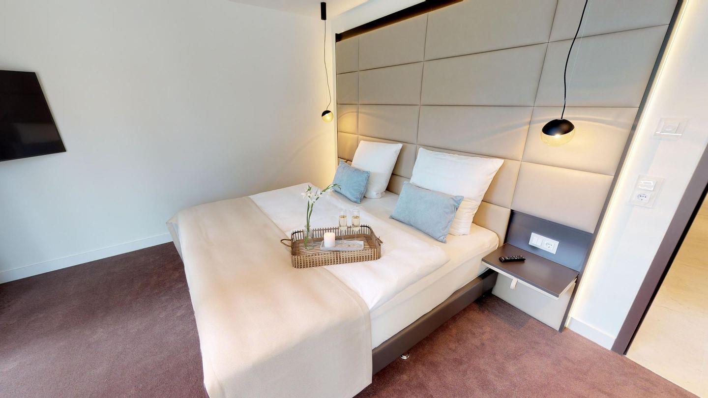 Sie können sich auf einen gemütlichen Wohn-/ Essbereich mit zwei Sofas freuen. Eines der Sofas bietet eine Schlafmöglichkeit für zwei Personen. Angrenzend liegt die offene, moderne Küchenzeile mit kompletter Ausstattung. Die zwei Schlafzimmer verfügen über jeweils ein Boxspring-Doppelbett - beide Schlafzimmer haben Zugang zu einem Balkon. Das moderne Bad mit Dusche sowie die eigene Sauna (2,37m x 1,19m) runden die Suite ab.