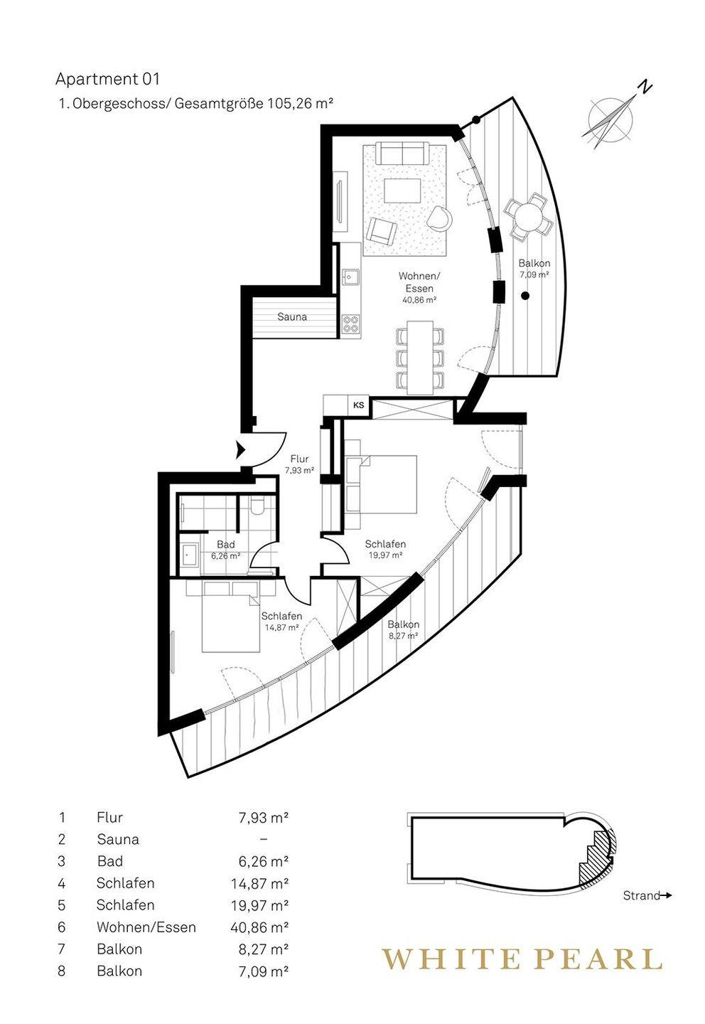 Nur wenige Minuten vom Strand entfernt befindet sich die Luxussuite 1.01 im 1. Obergeschoss des "White Pearl" und bietet auf 105 m² Platz für 4 (+2) Personen – auch Ihr Hund ist willkommen. Die Suite verfügt über zwei separate Schlafzimmer sowie ein Schlafsofa im Wohnbereich für zwei Personen.