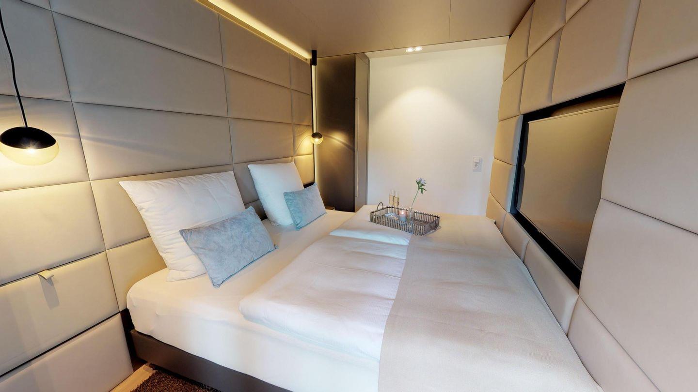 Sie erwartet eine gut ausgestattete Küchenzeile mit einer Essecke im Wohnbereich. Darüber hinaus gibt es ein modernes Badezimmer mit Dusche. Der offene Wohn- und Essbereich wird durch eine gemütliche Couch abgerundet. Das separate Schlafzimmer verfügt über ein Boxspring-Doppelbett, das durch Lamellen-Schiebetüren abgetrennt werden kann.