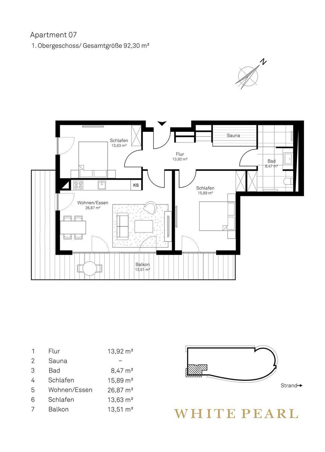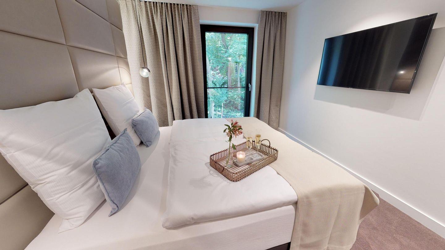 Die großzügige Luxussuite 1.07 befindet sich im 1. Obergeschoss des "White Pearl" und bietet Platz für 4 Erwachsene und ein Kind auf 92 m² mit zwei separaten Schlafzimmern und einer Schlafcouch im Wohnbereich.