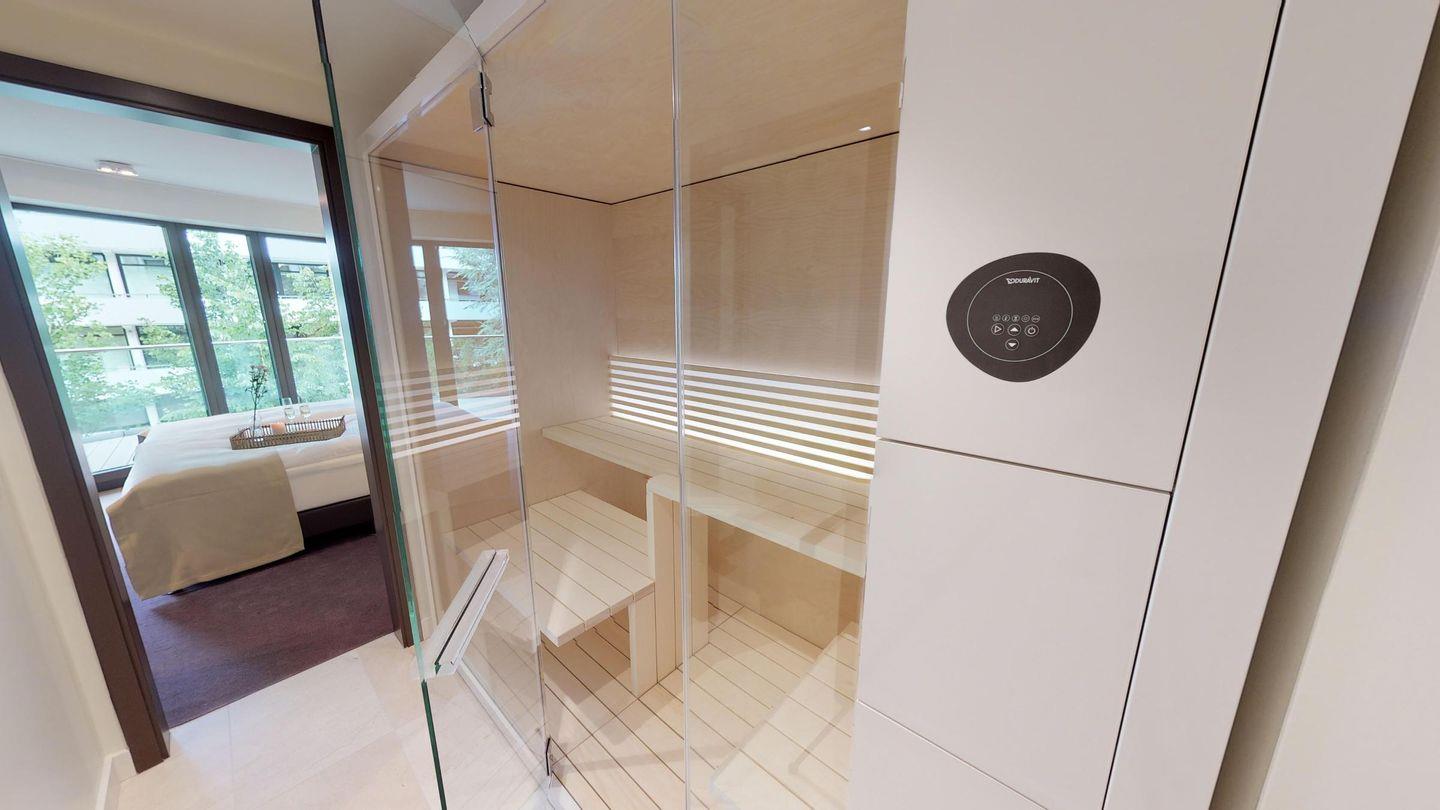 Highlights der Suite sind die eigene Sauna (2,37m x 1,19m) sowie der möblierte Balkon, der entspannte Stunden an der frischen Meeresluft ermöglicht! Zur Wohnung gehört ein Tiefgaragenstellplatz.
