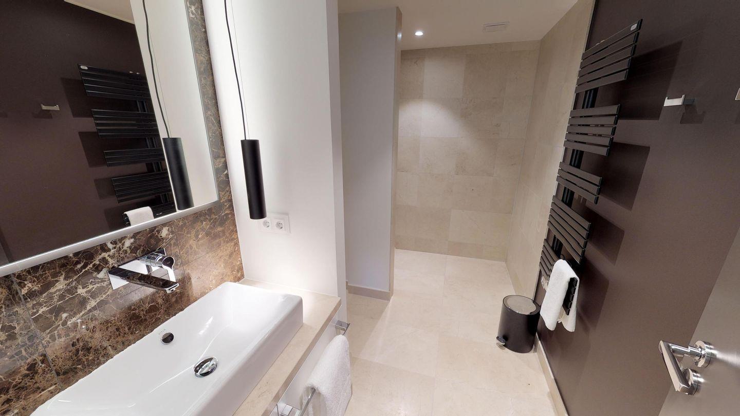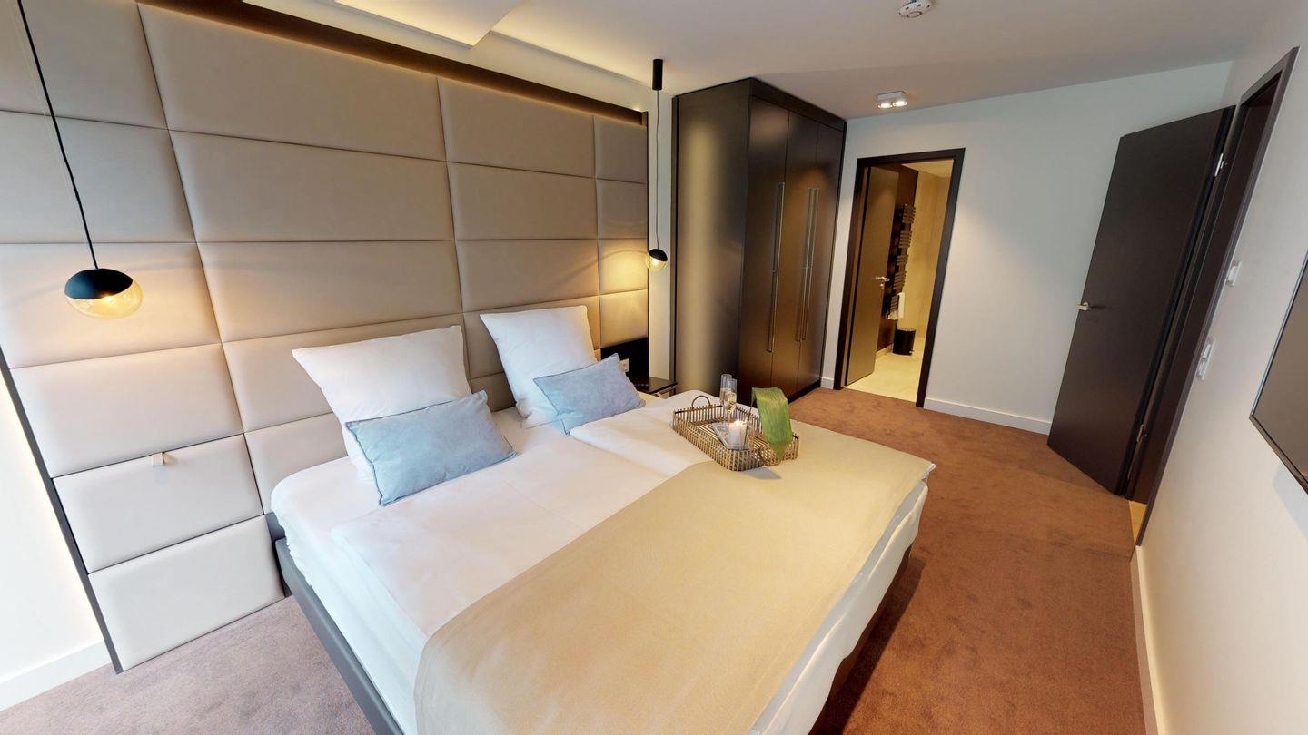 Es erwartet Sie eine voll ausgestattete Küchenzeile mit anschließendem Essbereich sowie der gemütliche Wohnbereich mit Sesseln und einem Sofa. Eines der Schlafzimmer liegt angrenzend ans Wohnzimmer, verfügt über ein Boxspring-Doppelbett und kann durch Lamellen-Schiebetüren abgetrennt werden. Das andere separate Schlafzimmer mit einem Boxspring-Doppelbett hat ein eigenes luxuriöses Bad mit Dusche und Zugang zum Balkon. Des Weiteren gibt es ein separates, modernes Bad mit Dusche.