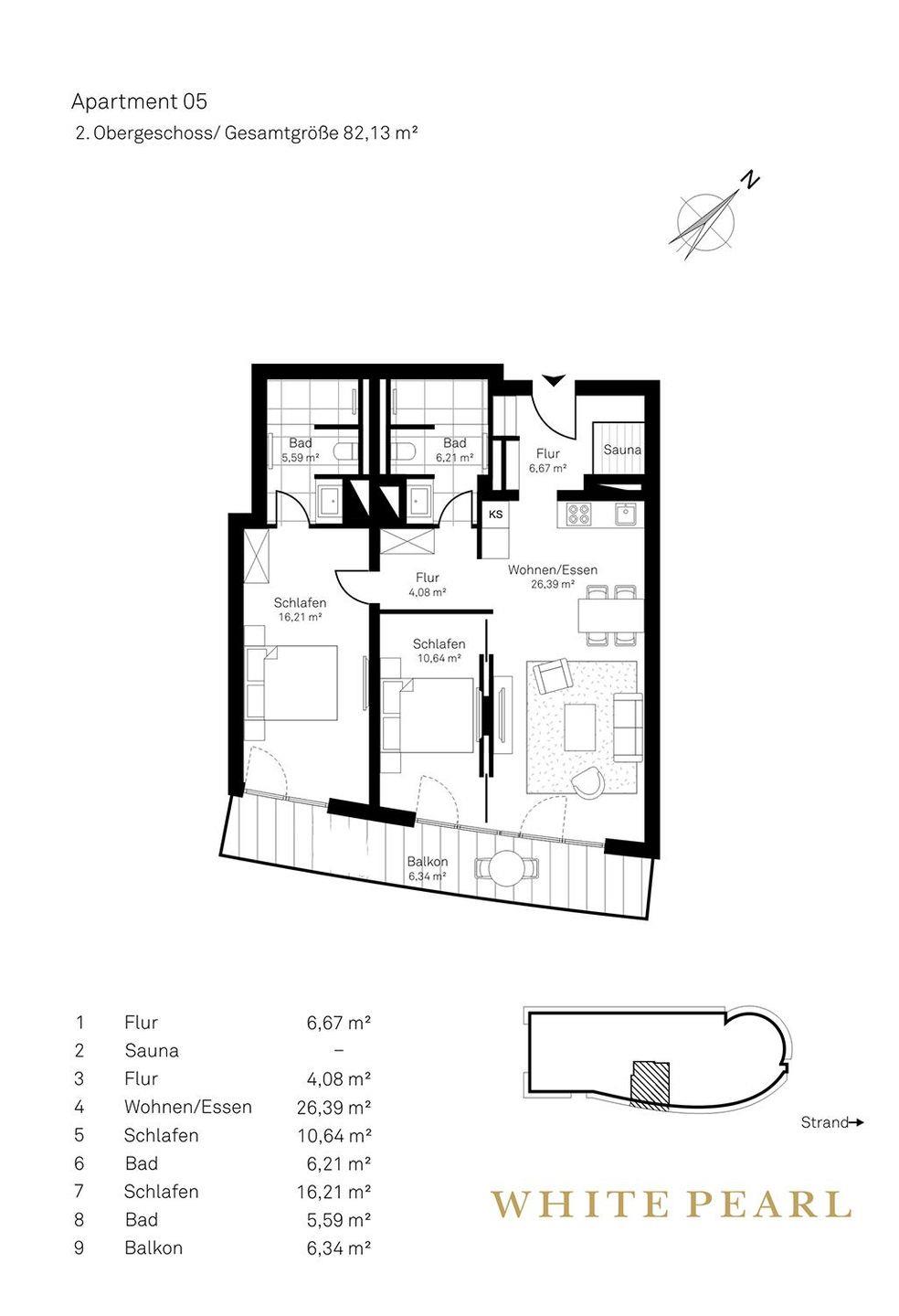 Die großzügige Luxussuite 2.05 befindet sich im 2. Obergeschoss des "White Pearl" und bietet Platz für 4 Personen auf 82 m² mit zwei separaten Schlafzimmern – auch Ihr Hund ist herzlich willkommen!