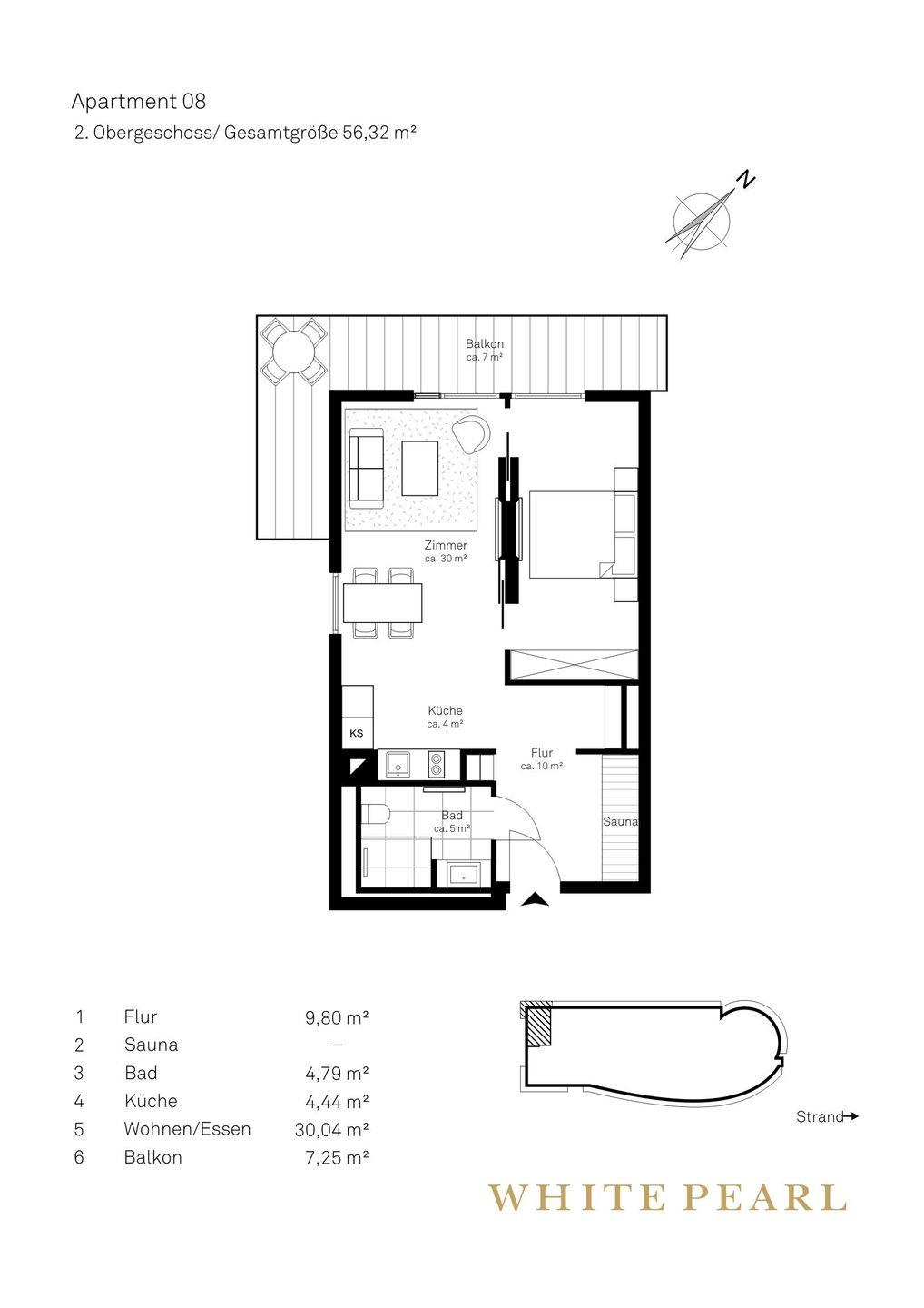 Nur wenige Gehminuten vom Strand entfernt befindet sich das Luxusapartment 2.08 im 2. Obergeschoss des "White Pearl", das auf 56 m² Platz für 2 Personen bietet.