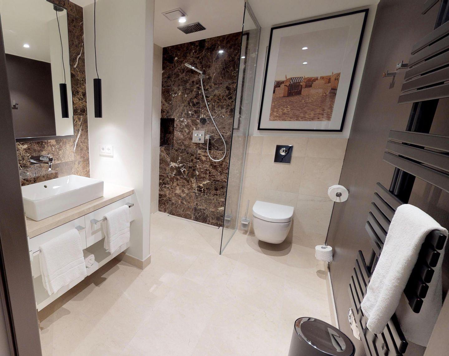 Highlights des Apartments sind die eigene Sauna (2,37m × 1,19m) sowie der möblierte Balkon mit Sonnenliegen, der entspannte Stunden an der frischen Meeresluft ermöglicht! Zur Wohnung gehört ein Tiefgaragenstellplatz. Diese Wohnung ist barrierefrei gem. LBO.