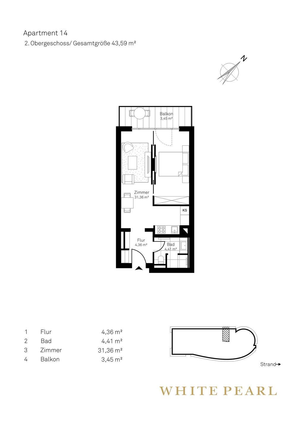Nur wenige Gehminuten vom Strand entfernt befindet sich das Luxusapartment 2.14 im 2. Obergeschoss des "White Pearl", das auf 44 m² Platz für 2 Personen bietet.