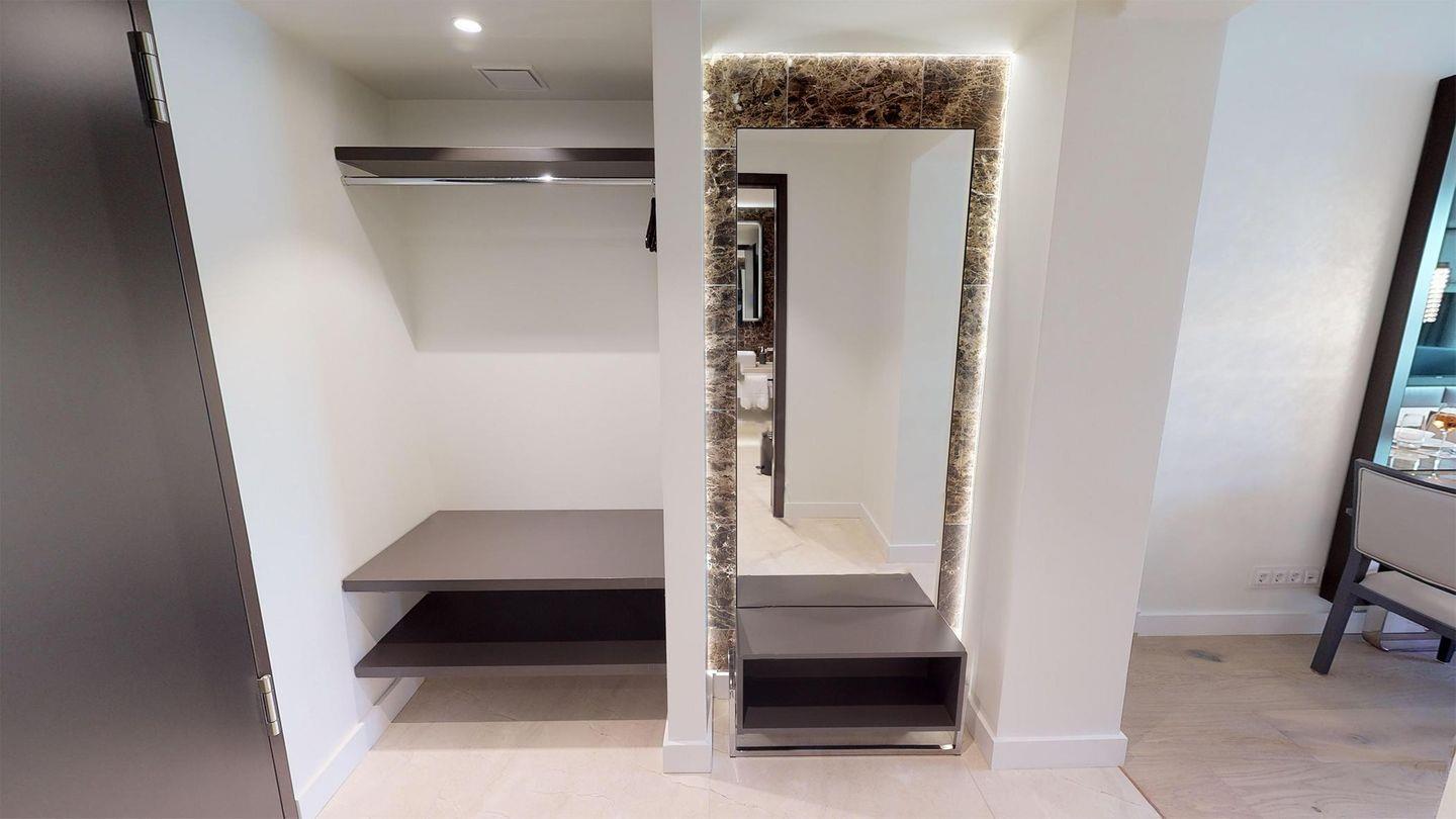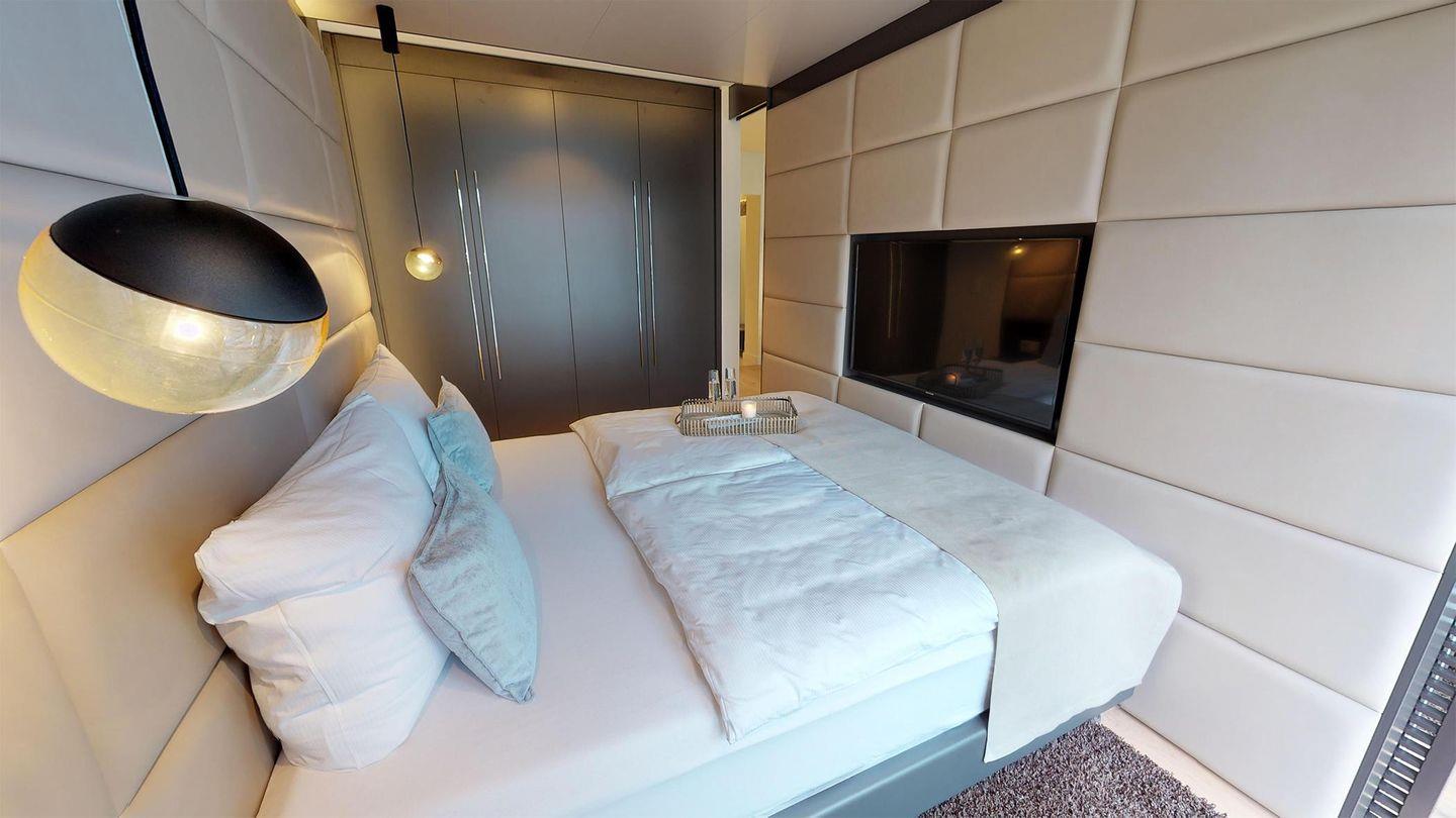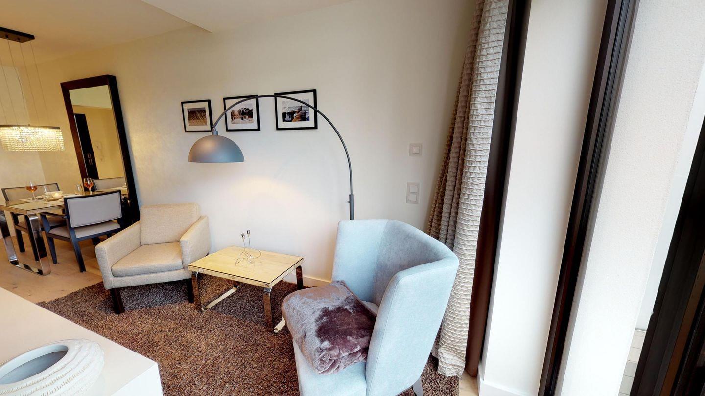 Das Apartment verfügt über eine voll ausgestattete Küchenecke mit einem Essbereich, der an das Wohnzimmer angrenzt. Der offene Wohn- und Essbereich wird durch zwei bequeme Sessel ergänzt. Im separaten Schlafzimmer befindet sich ein Boxspring-Doppelbett, das durch Lamellen-Schiebetüren abgetrennt werden kann. Zusätzlich gibt es ein luxuriöses Badezimmer mit Dusche.