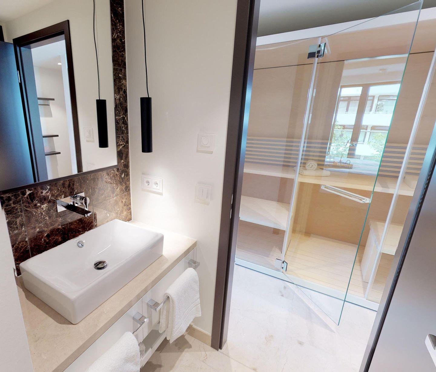 Besondere Highlights des Apartments sind die eigene gläserne Sauna (2,37m × 1,19m) sowie der möblierte Balkon mit eingeschränkten Meerblick, der zu entspannten Stunden an der frischen Luft einlädt! Zur Wohnung gehört außerdem ein Tiefgaragenstellplatz.