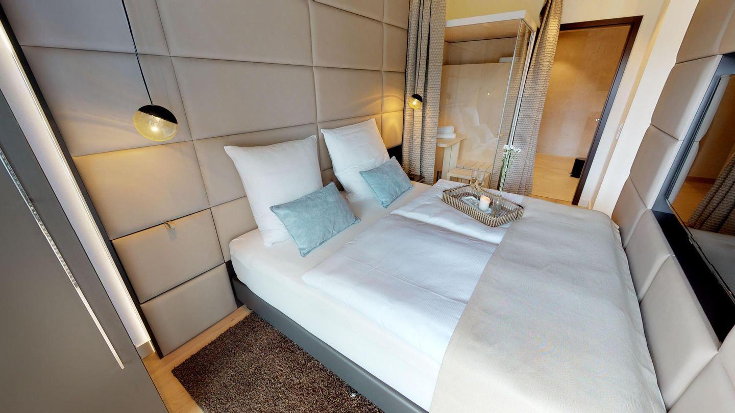 Besondere Highlights des Apartments sind die eigene gläserne Sauna (1,17m × 1,17m) sowie der möblierte Balkon mit Sonnenliegen, der zu entspannten Stunden an der frischen Luft einlädt! Zur Wohnung gehört außerdem ein Tiefgaragenstellplatz.