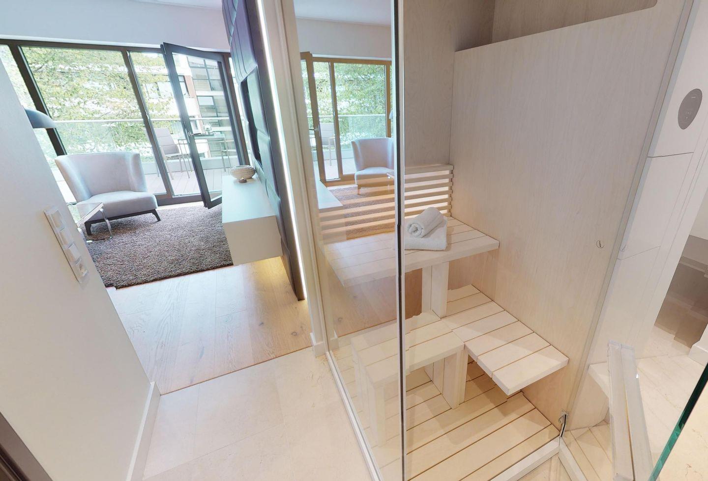 Besondere Highlights des Apartments sind die eigene kleine Sauna (1,17m × 1,17m) sowie der möblierte Balkon, der zu entspannten Stunden an der frischen Luft einlädt! Zur Wohnung gehört außerdem ein Tiefgaragenstellplatz.