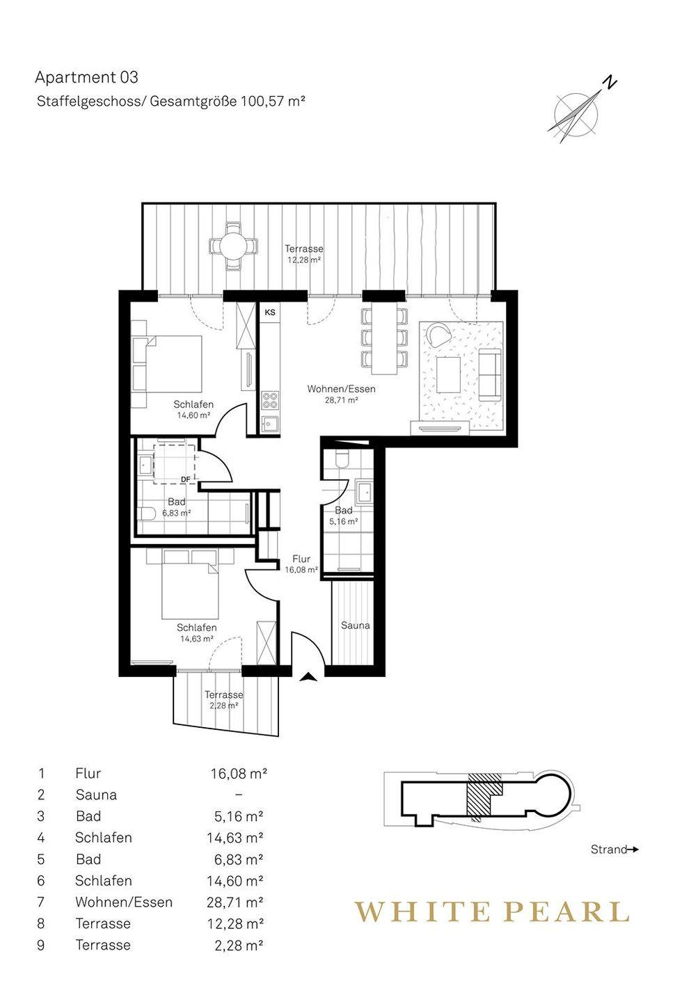 Das Luxus-Penthouse 4.03 befindet sich nur wenige Gehminuten von der Ostsee entfernt im vierten Obergeschoss des "White Pearl" und bietet auf 101 m² Platz für 4 Personen.