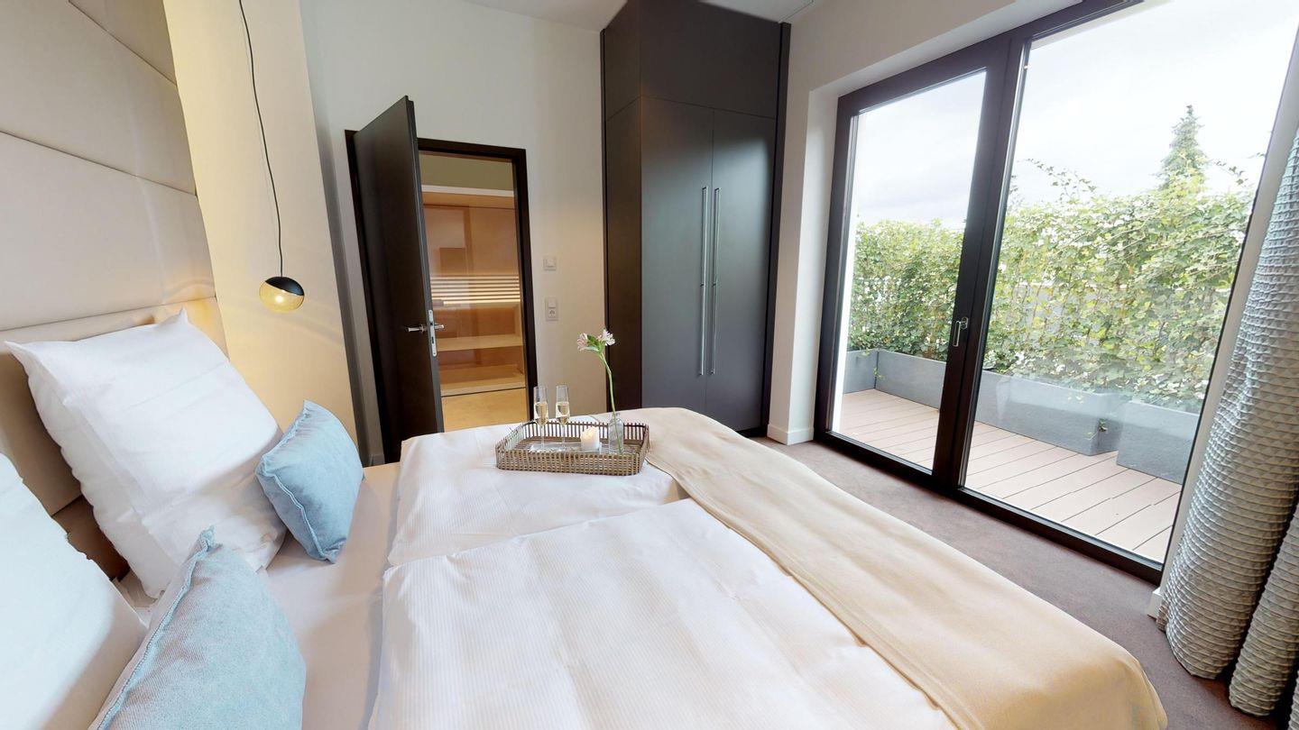 Zu den Highlights des Penthouses gehören eine eigene, gläserne Sauna (2,37m x 1,19m) sowie der herrliche, möblierte Balkon mit Strandkorb, der zu entspannten Stunden an der frischen Meeresluft einlädt. Zur Wohnung gehört ein Tiefgaragenstellplatz. Diese Wohnung ist barrierefrei gemäß der LBO. Unsere Appartements in der obersten Etage sind über die gemeinschaftliche Dachterrasse zu erreichen.