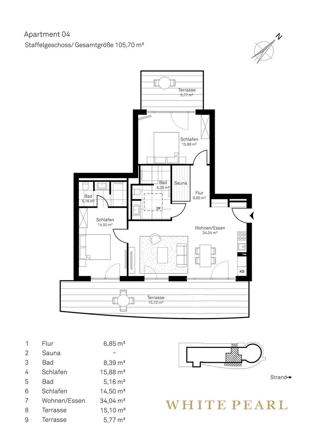 Das Luxus-Penthouse 4.04 befindet sich nur wenige Gehminuten von der Ostsee entfernt im 4. Obergeschoss des "White Pearl" und bietet auf 106 m² Platz für 4 Personen.