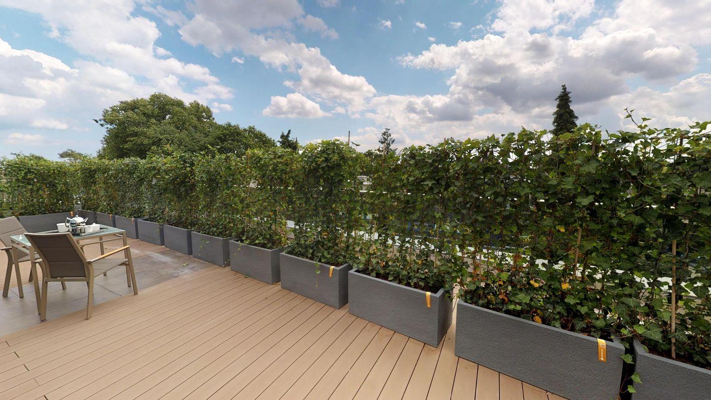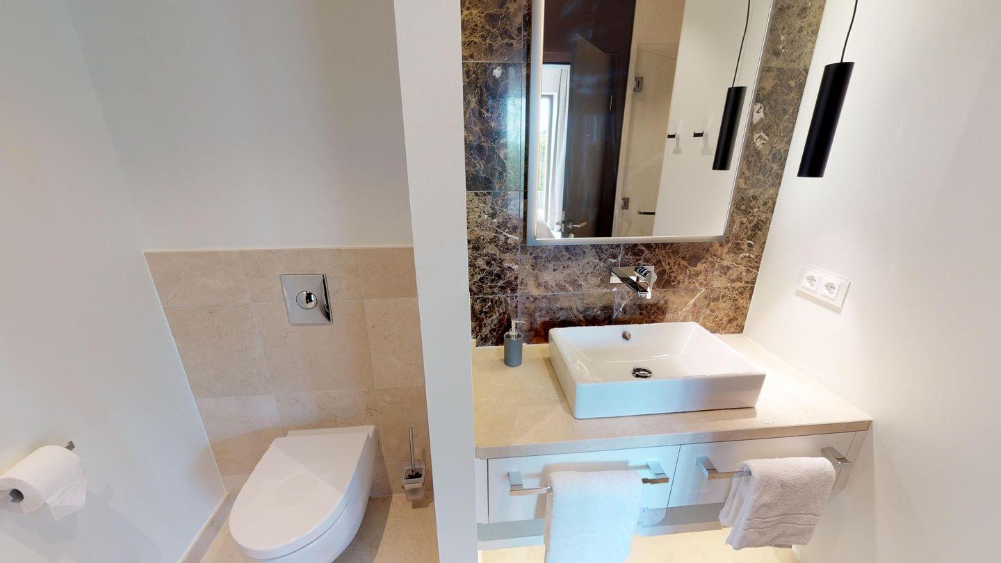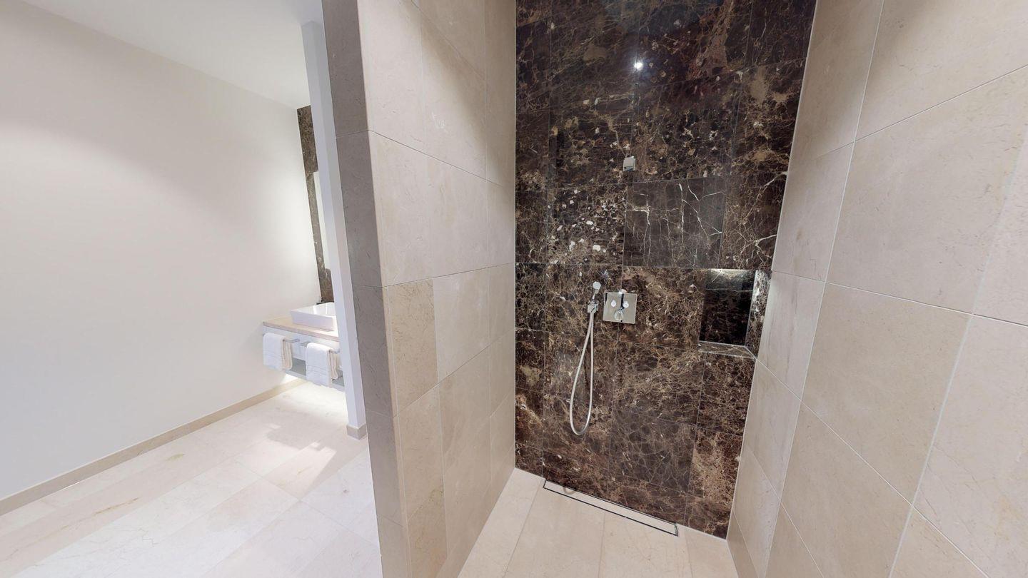 Das großzügige Penthouse verfügt über zwei separate Schlafzimmer, jeweils mit einem Boxspring-Doppelbett ausgestattet und Zugang zu einer eigenen, kleinen Terrasse. Eines der Schlafzimmer verfügt zusätzlich über ein eigenes Bad mit Dusche. Weiterhin gibt es einen lichtdurchfluteten Wohnbereich, der an die offene, voll ausgestattete Küchenzeile sowie an den schönen Essbereich angrenzt. Ein weiteres luxuriöses Badezimmer mit Dusche rundet das Penthouse ab.