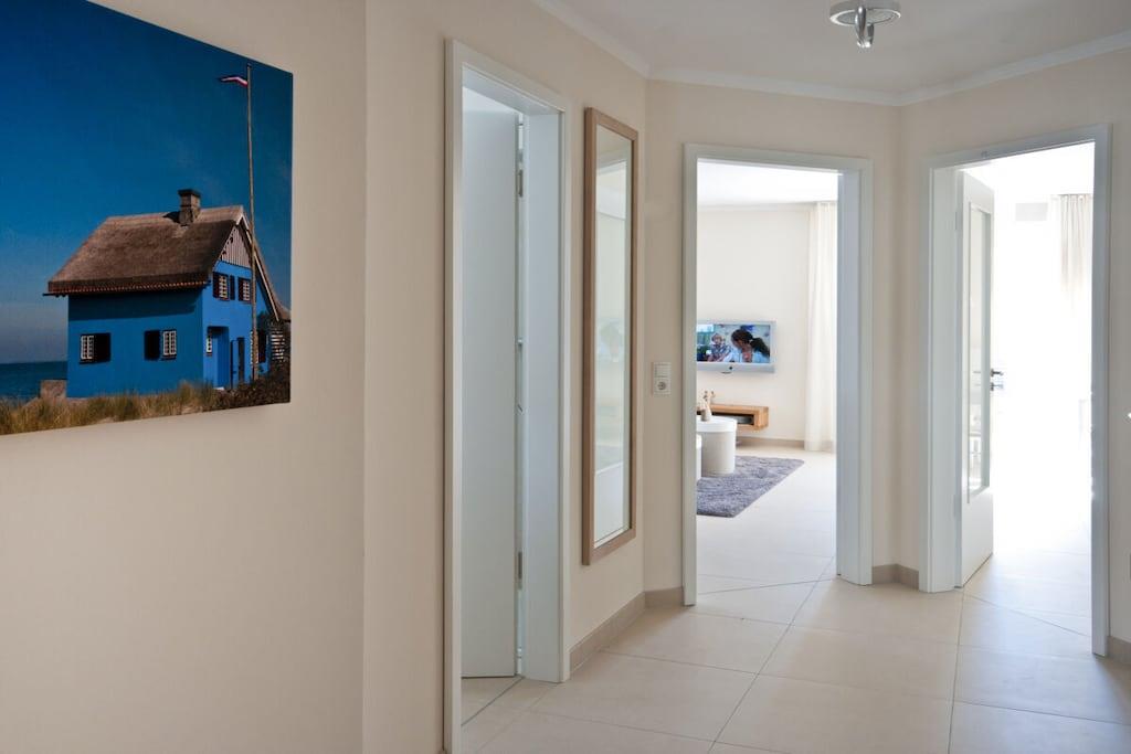 Die exklusive Ferienwohnung „Deck 3“ befindet sich im 1. Obergeschoss des Ferienhauses Ostsee Lodges mit Sauna und Fitnessbereich. Genießen Sie Ihren Urlaub in der 75 qm großen hellen Wohnung, mit bodentiefen Fenstern, Süd – Ostbalkon, elektr. Sonnenmarkise und Sonnenrolos, kostenlosen Internetzugang über WLAN. Sie gelangen von der komfortablen halboffenen Küche in den großzügigen Wohn-Essbereich. Ausgestattet mit Loewe-TV´s, Musikanlage,2 Schlafzimmern mit hohem Schlafkomfort. Das spezialangefertigte Etagenbett im 2. Schlafzimmer mit Buch- und Leseablage sorgt für Geborgenheit. Im hochwertigen hellen Bad haben Sie eine Glaskomfortdusche, Badewanne, Handtuchwärmer und eine Fußbodenheizung. E-Ladestation für Ihr E-Auto.