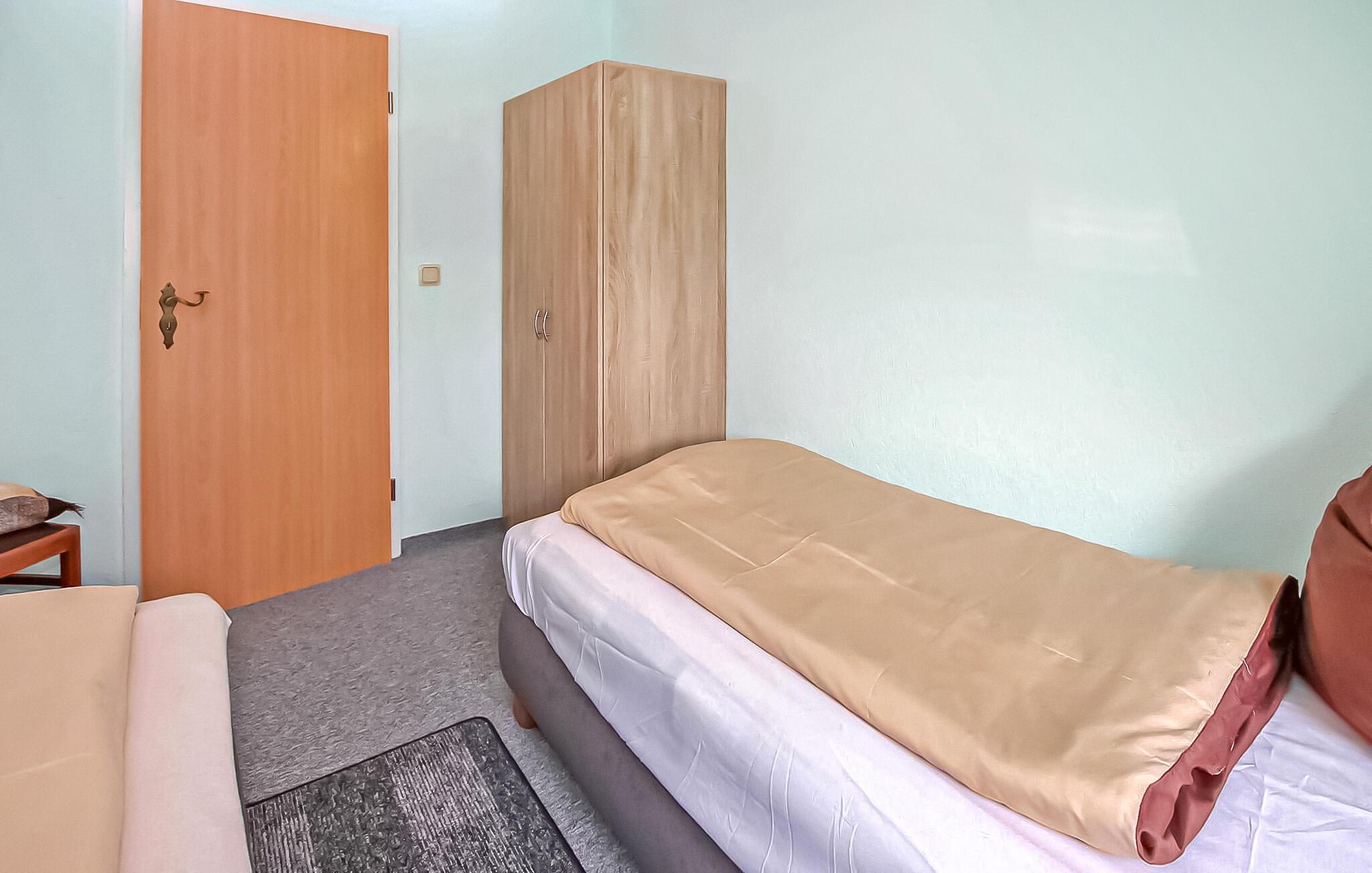 Die 2018 renovierten Wohnungen werden mit Nachtspeicher-Öfen beheizt. Diese große Wohnung für bis zu 2 Erwachsene und 1 Baby im Obergeschoss verfügt über eine Wohnküche (Ess-Ecke, Sofa, Flachbild-TV, E-Kochplatten, Kühlschrank mit Gefriermöglichkeit, Mikrowelle, div. Küchenkleingeräte), ein Schlafzimmer (1 x 2 Einzelbetten), ein Bad mit Wanne, WC und Fön sowie über einen Flur. BITTE BEACHTEN: Der Wohnungszugang führt über den gemeinsamen Eingangsbereich/Flur im unteren Geschoss, die Räume sind einzeln abschließbar. Im Gesamtpreis sind die Endreinigung, Wasser- und Energieverbrauch, Bettwäsche sowie Handtücher eingeschlossen. Haustiere sind in diesem Objekt nicht erlaubt.