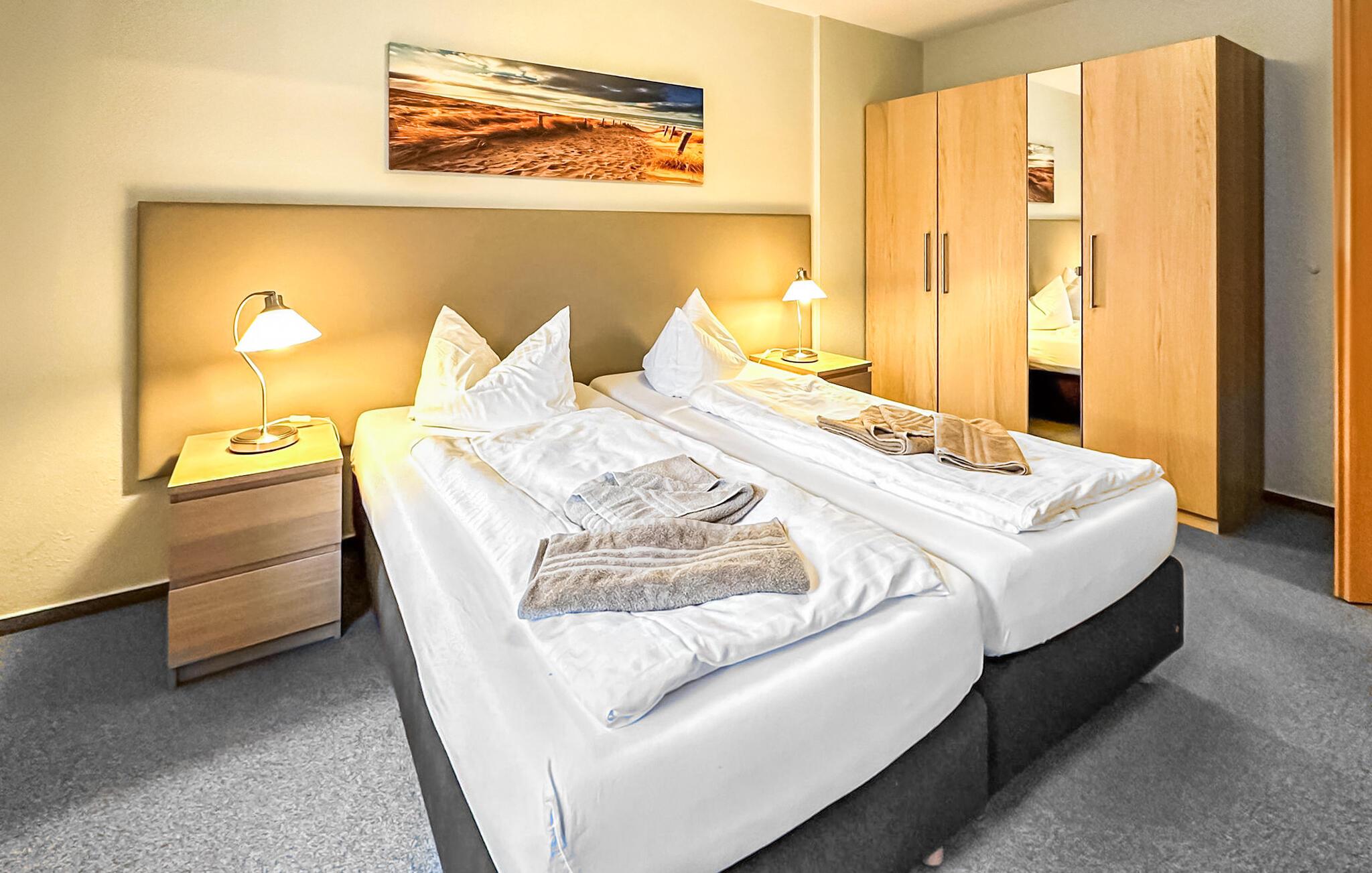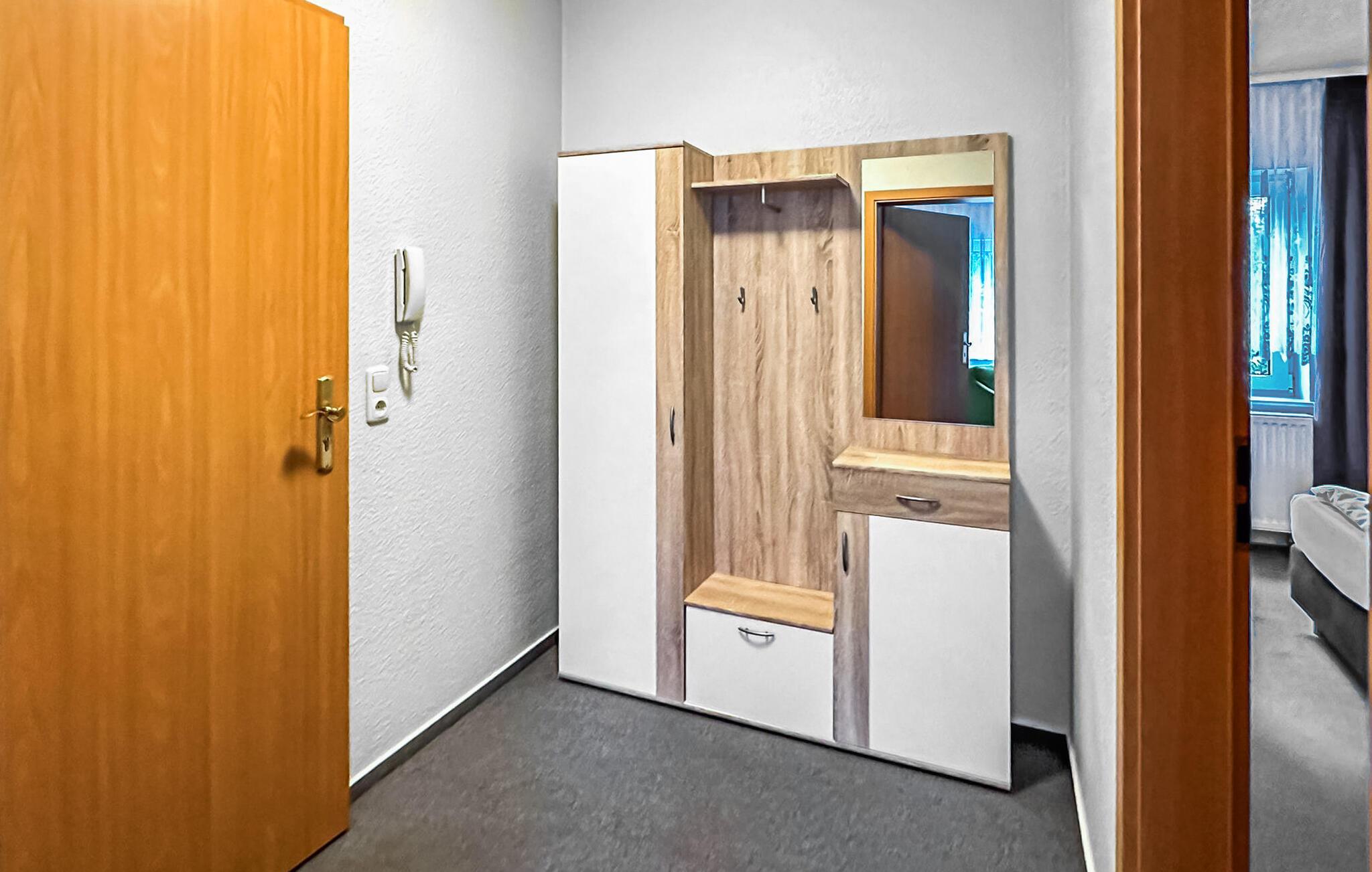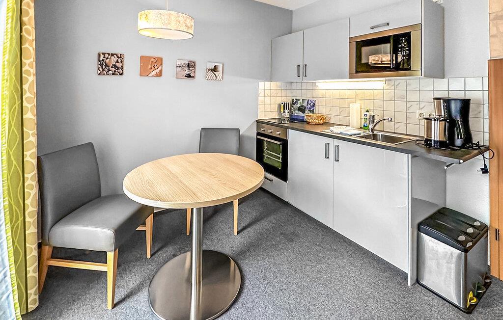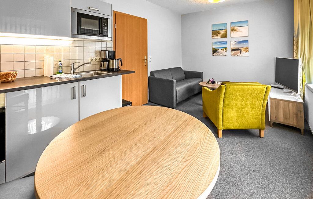 Die 45 qm große 2-Zimmer-Wohnung für 2 Personen liegt im Erdgeschoss des Hauses und ist über eine zentrale Treppe erreichbar. Die Wohnung verfügt über ein Wohnzimmer mit Esstisch und offener Küchenzeile (Polstermöbel, Flachbild-TV, Esstisch, Elektroherd, Backofen, Kühlschrank mit Gefrierfach, Mikrowelle, diverse Küchengeräte), ein Schlafzimmer (Doppelbett) und ein Badezimmer mit Dusche/WC. Vom Wohnzimmer gelangt man auf die möblierte Terrasse und das angrenzende kleine Gartengrundstück. Für Kleinkinder kann ein Kinderbett und ein Hochstuhl bereitgestellt werden. W-LAN ist ebenfalls vorhanden. Auf dem Grundstück stehen je Wohnung ein Parkplatz, Fahrradständer und ein zentraler Grillplatz auf dem Nachbargrundstück zur Verfügung.