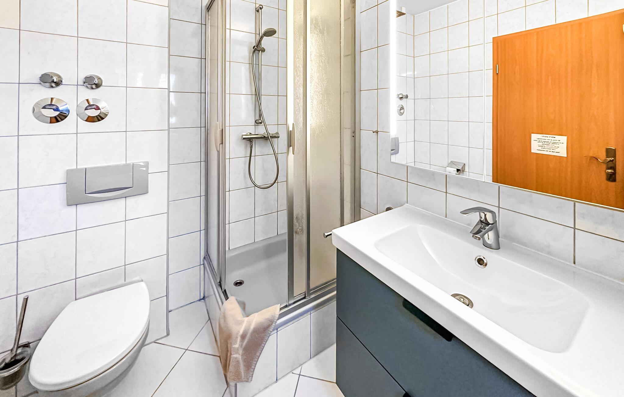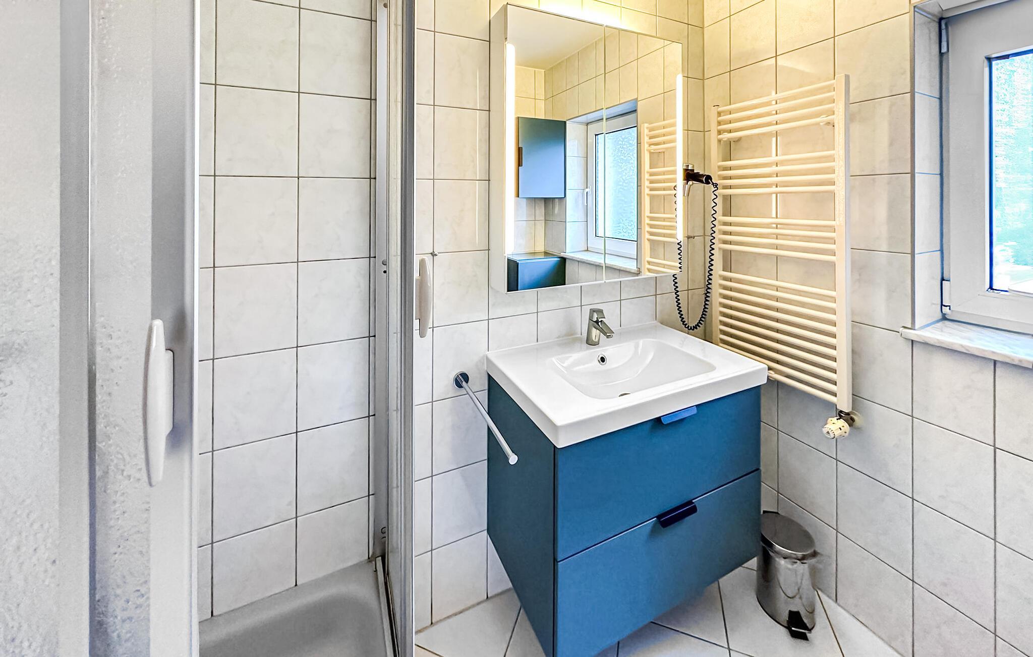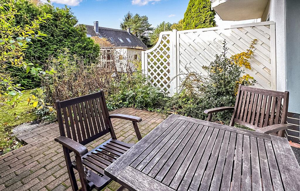 Die 45 qm große 2-Zimmer-Wohnung für 2 Personen liegt im Erdgeschoss des Hauses und ist über eine zentrale Treppe erreichbar. Die Wohnung verfügt über ein Wohnzimmer mit Esstisch und offener Küchenzeile (Polstermöbel, Flachbild-TV, Esstisch, Elektroherd, Backofen, Kühlschrank mit Gefrierfach, Mikrowelle, diverse Küchengeräte), ein Schlafzimmer (Doppelbett) und ein Badezimmer mit Dusche/WC. Vom Wohnzimmer gelangt man auf die möblierte Terrasse und das angrenzende kleine Gartengrundstück. Für Kleinkinder kann ein Kinderbett und ein Hochstuhl bereitgestellt werden. W-LAN ist ebenfalls vorhanden. Auf dem Grundstück stehen je Wohnung ein Parkplatz, Fahrradständer und ein zentraler Grillplatz auf dem Nachbargrundstück zur Verfügung.