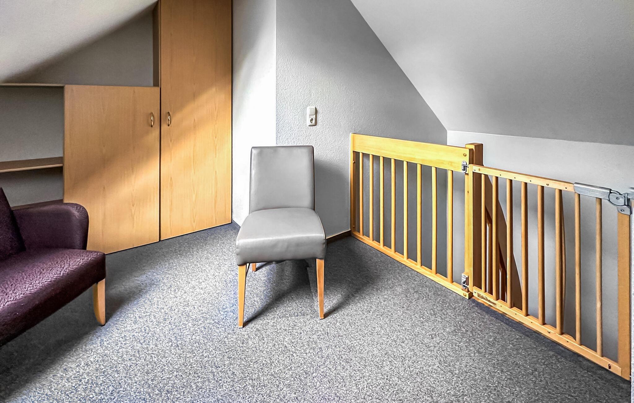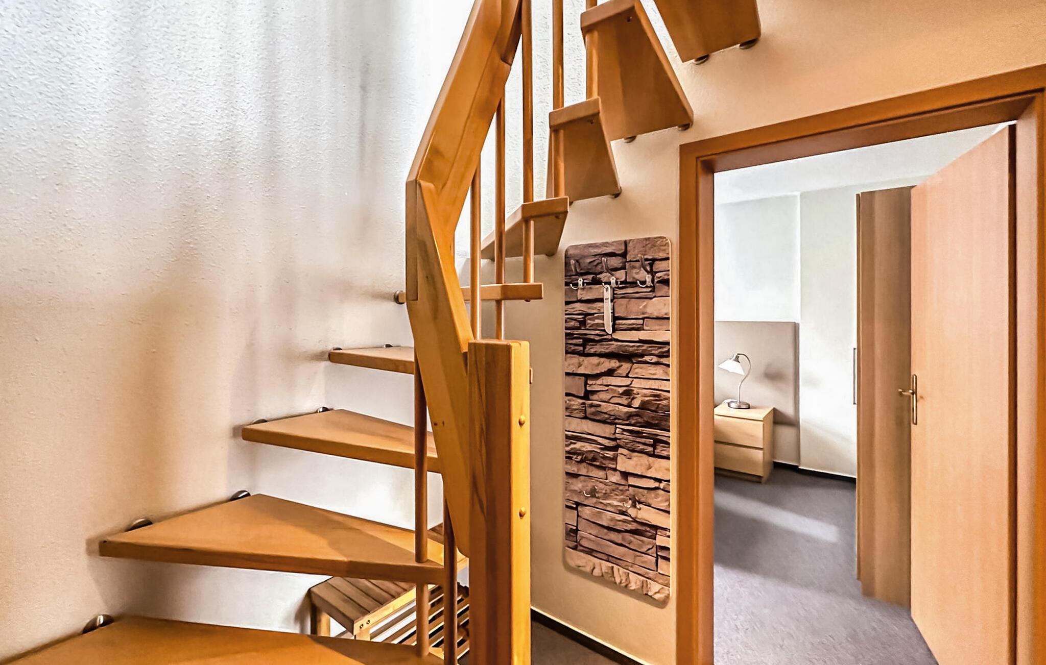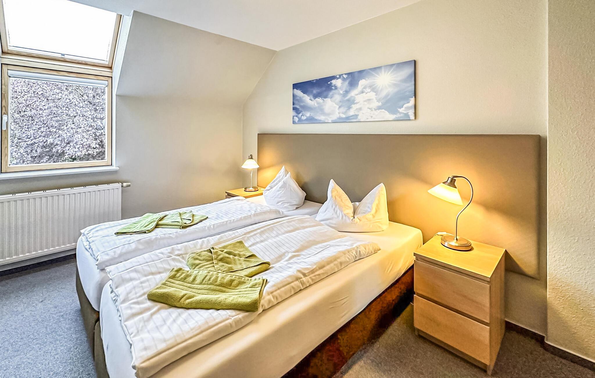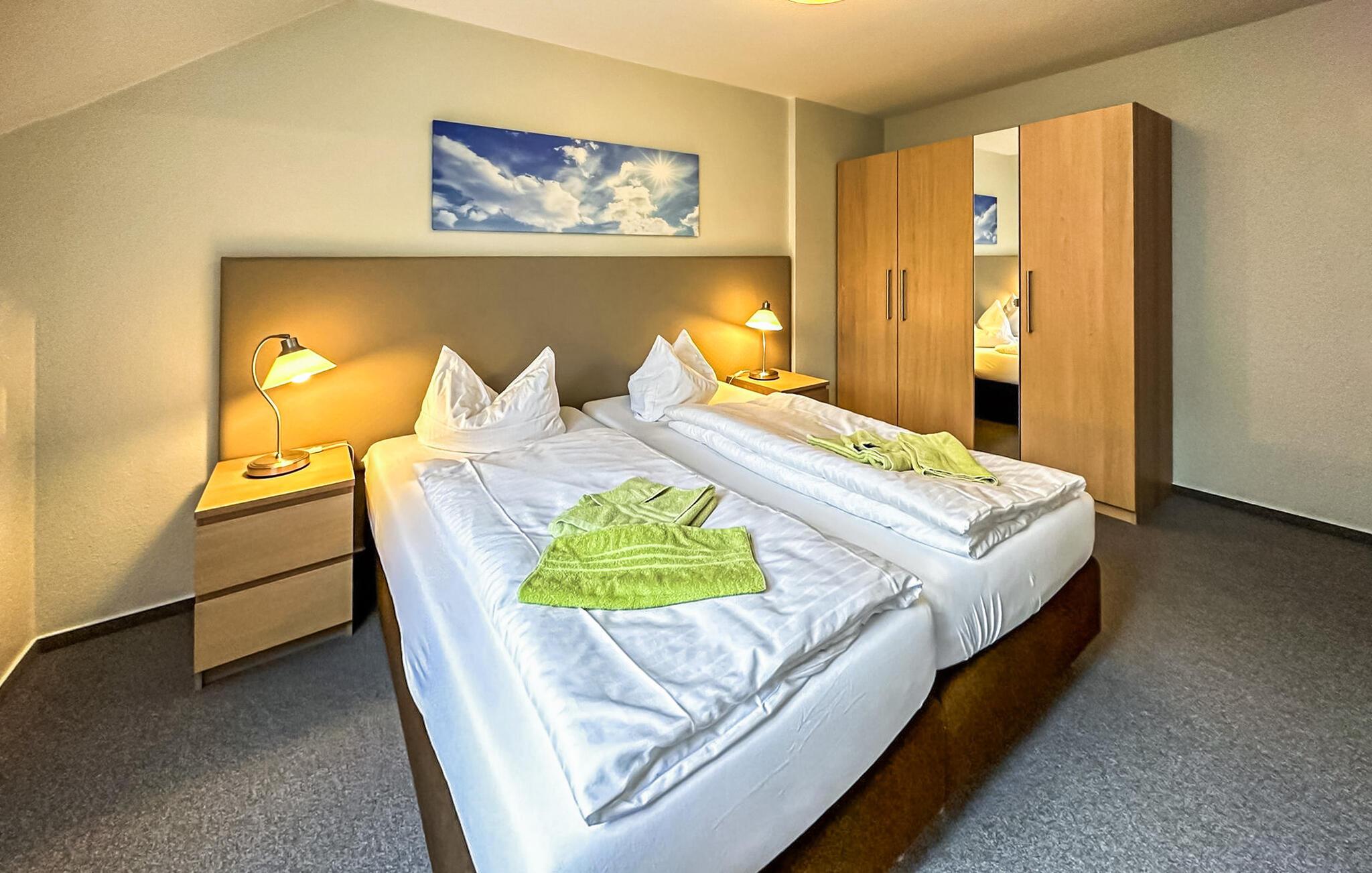 Die 3-Zimmer-Wohnung mit 62 qm für 4 Personen liegt im Ober- bzw. Dachgeschoss und ist über eine zentrale Treppe erreichbar. Es verfügt über ein Wohnzimmer mit Esstisch und offener Küchenzeile (Polstermöbel, Flachbild-TV, Esstisch, Elektroherd, Backofen, Kühlschrank mit Gefrierfach, Mikrowelle, diverse Küchengeräte), ein Badezimmer mit Dusche/WC und ein Schlafzimmer mit Doppelbett (Durchgangszimmer zum Badezimmer). Über eine platzsparende Treppe gelangt man in einen weiteren Wohn-/Schlafbereich mit 2 Einzelbetten, TV und Sitzgelegenheit. Es gibt auch einen möblierten Balkon. Für Kleinkinder kann ein Kinderbett und ein Hochstuhl bereitgestellt werden. WLAN ist ebenfalls verfügbar. Für jede Wohnung auf dem Grundstück stehen ein Parkplatz, Fahrradständer und ein zentraler Grillplatz auf dem Nachbargrundstück zur Verfügung.