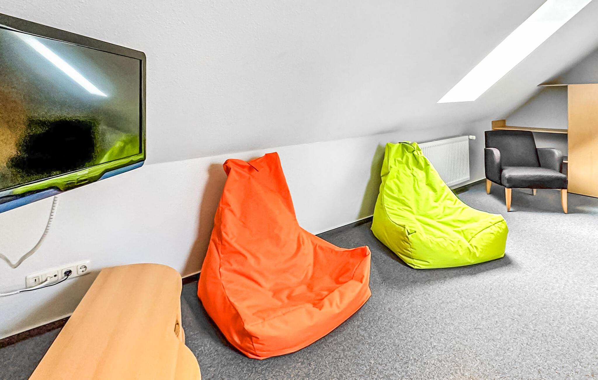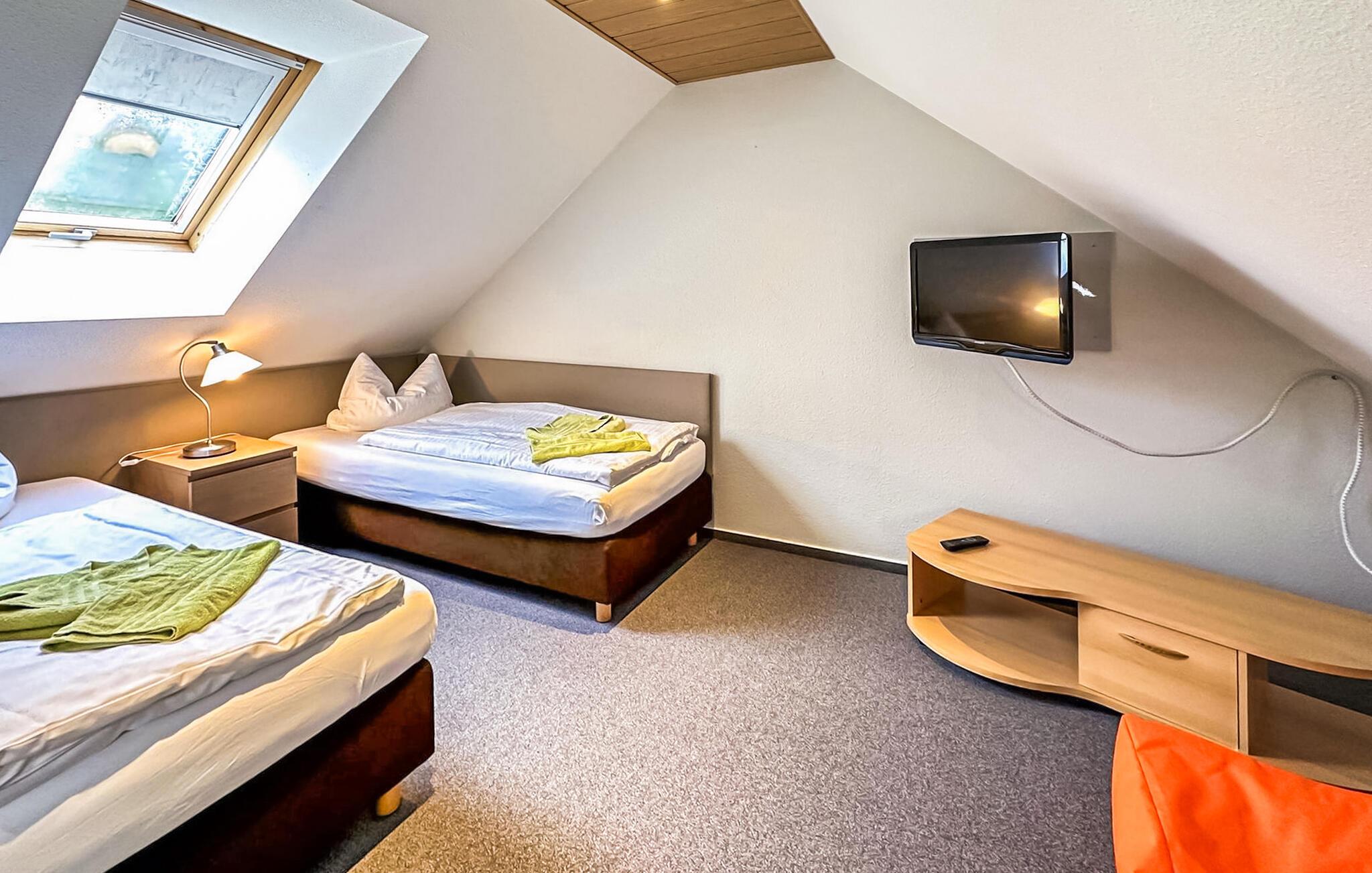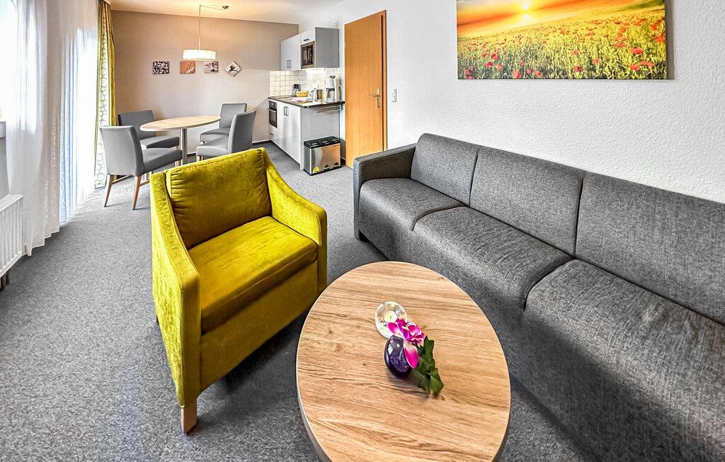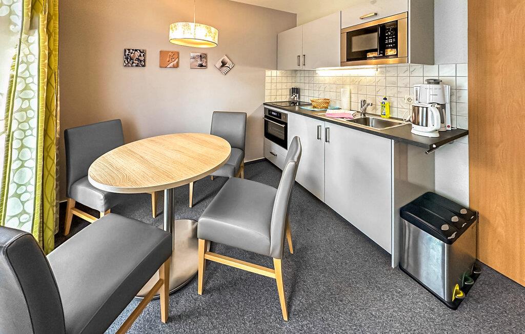 Die 3-Zimmer-Wohnung mit 62 qm für 4 Personen liegt im Ober- bzw. Dachgeschoss und ist über eine zentrale Treppe erreichbar. Es verfügt über ein Wohnzimmer mit Esstisch und offener Küchenzeile (Polstermöbel, Flachbild-TV, Esstisch, Elektroherd, Backofen, Kühlschrank mit Gefrierfach, Mikrowelle, diverse Küchengeräte), ein Badezimmer mit Dusche/WC und ein Schlafzimmer mit Doppelbett (Durchgangszimmer zum Badezimmer). Über eine platzsparende Treppe gelangt man in einen weiteren Wohn-/Schlafbereich mit 2 Einzelbetten, TV und Sitzgelegenheit. Es gibt auch einen möblierten Balkon. Für Kleinkinder kann ein Kinderbett und ein Hochstuhl bereitgestellt werden. WLAN ist ebenfalls verfügbar. Für jede Wohnung auf dem Grundstück stehen ein Parkplatz, Fahrradständer und ein zentraler Grillplatz auf dem Nachbargrundstück zur Verfügung.