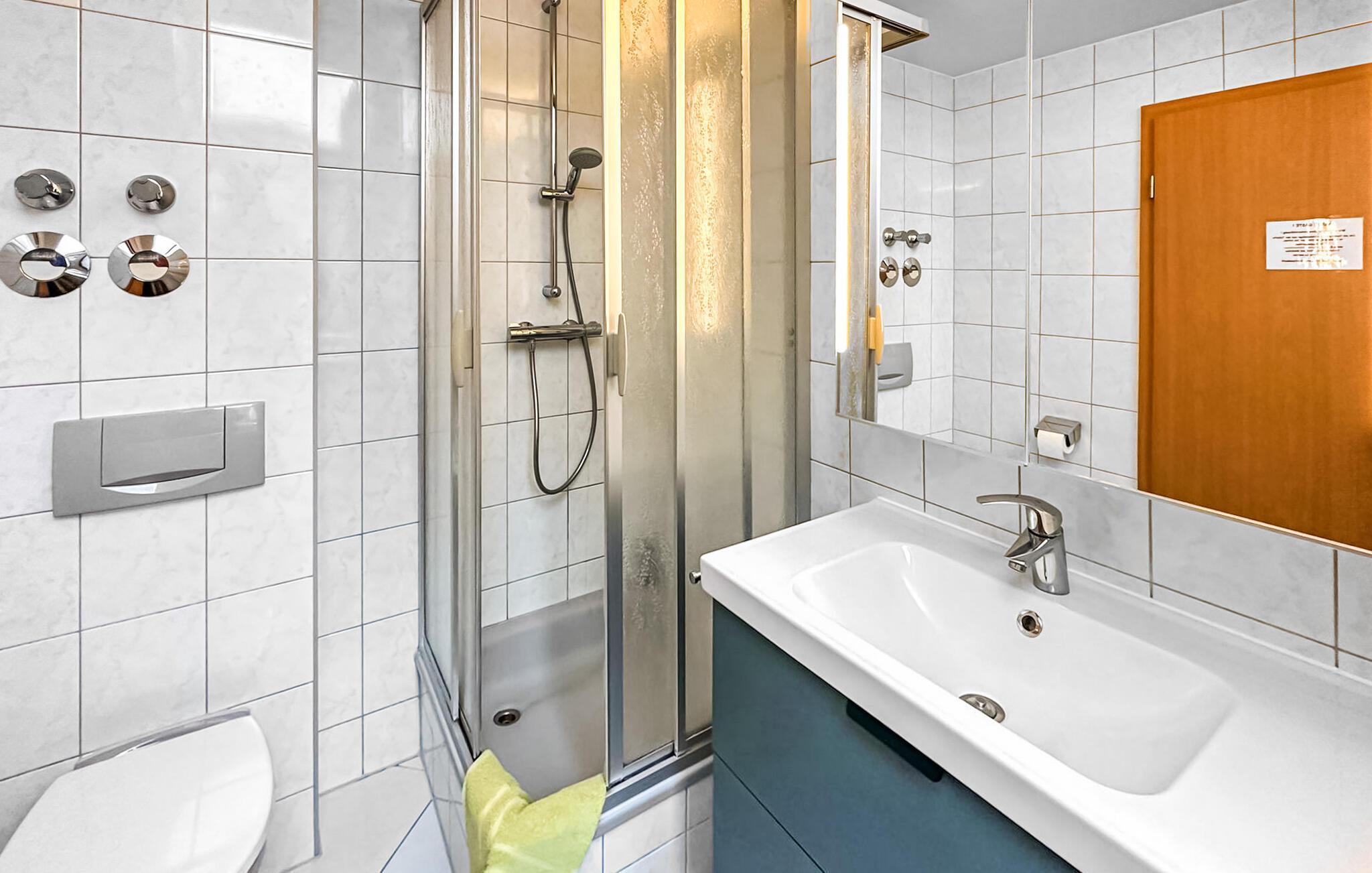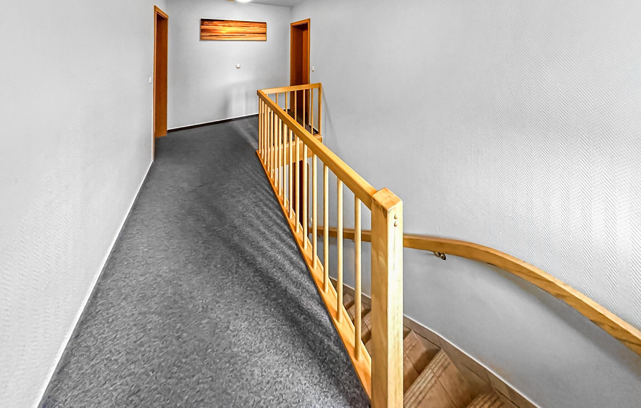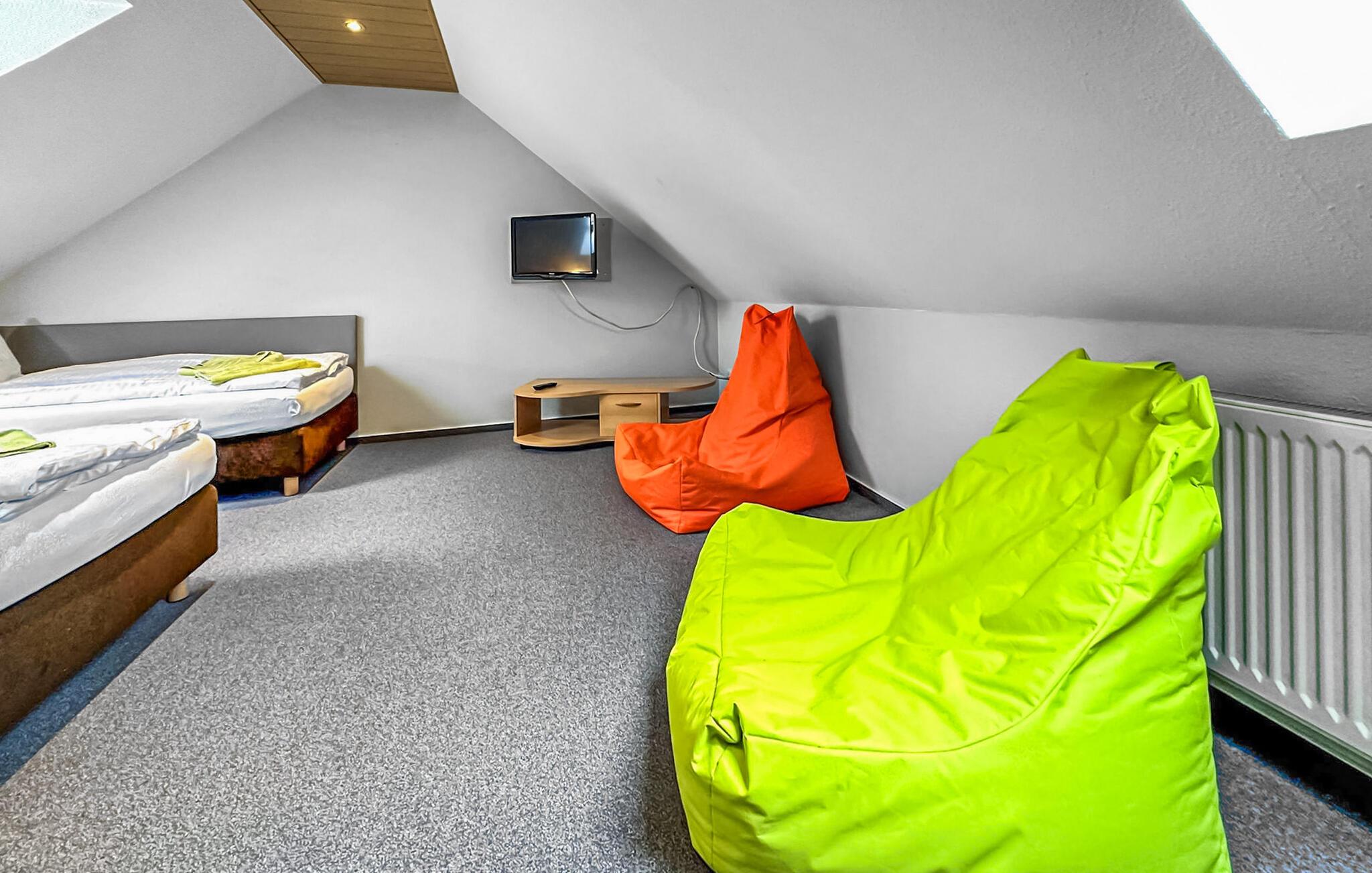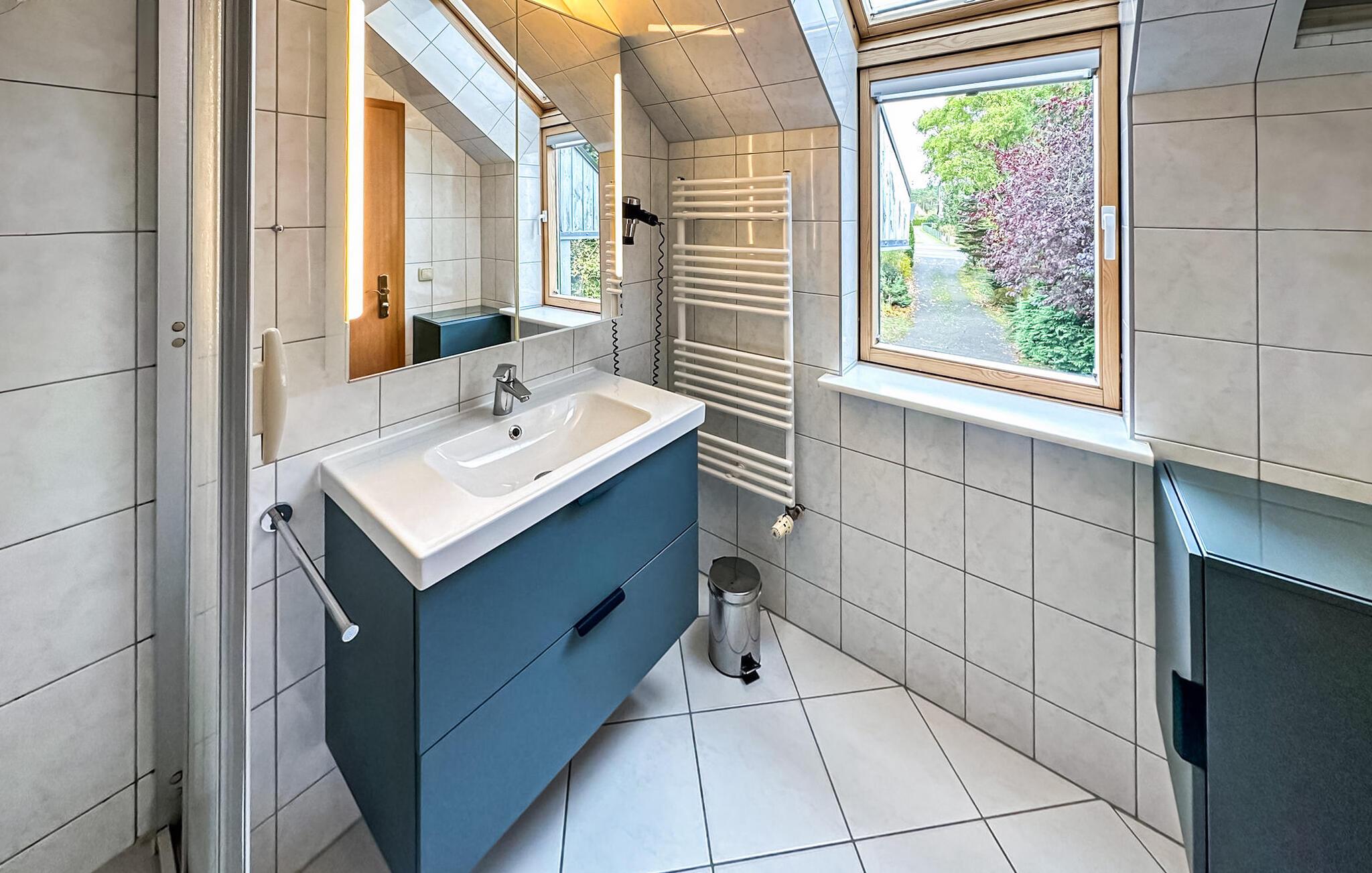 Die 3-Zimmer-Wohnung mit 62 qm für 4 Personen liegt im Ober- bzw. Dachgeschoss und ist über eine zentrale Treppe erreichbar. Es verfügt über ein Wohnzimmer mit Esstisch und offener Küchenzeile (Polstermöbel, Flachbild-TV, Esstisch, Elektroherd, Backofen, Kühlschrank mit Gefrierfach, Mikrowelle, diverse Küchengeräte), ein Badezimmer mit Dusche/WC und ein Schlafzimmer mit Doppelbett (Durchgangszimmer zum Badezimmer). Über eine platzsparende Treppe gelangt man in einen weiteren Wohn-/Schlafbereich mit 2 Einzelbetten, TV und Sitzgelegenheit. Es gibt auch einen möblierten Balkon. Für Kleinkinder kann ein Kinderbett und ein Hochstuhl bereitgestellt werden. WLAN ist ebenfalls verfügbar. Für jede Wohnung auf dem Grundstück stehen ein Parkplatz, Fahrradständer und ein zentraler Grillplatz auf dem Nachbargrundstück zur Verfügung.