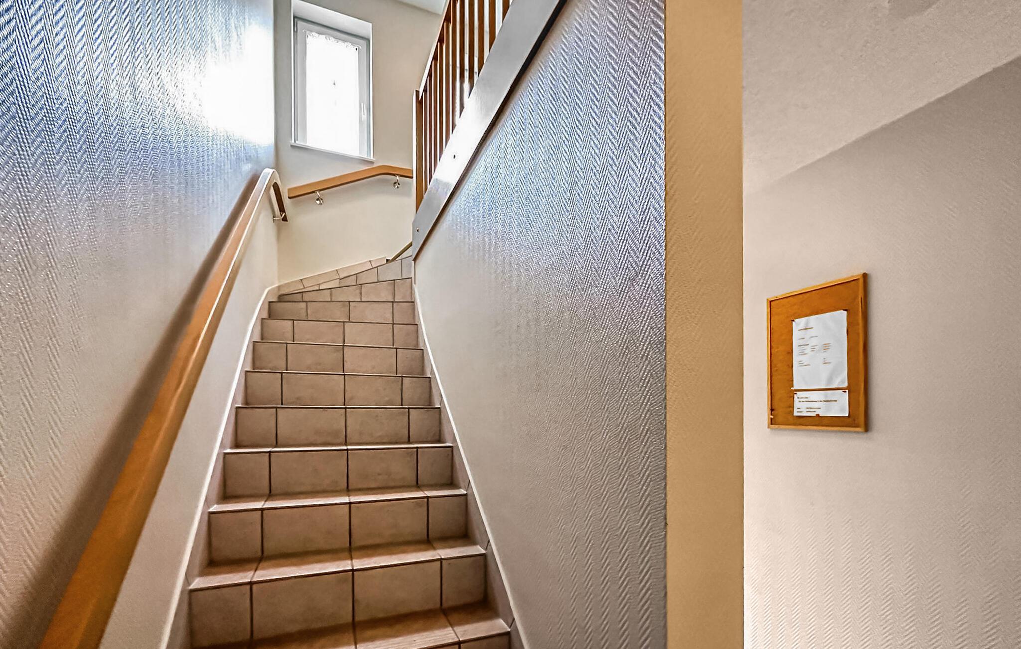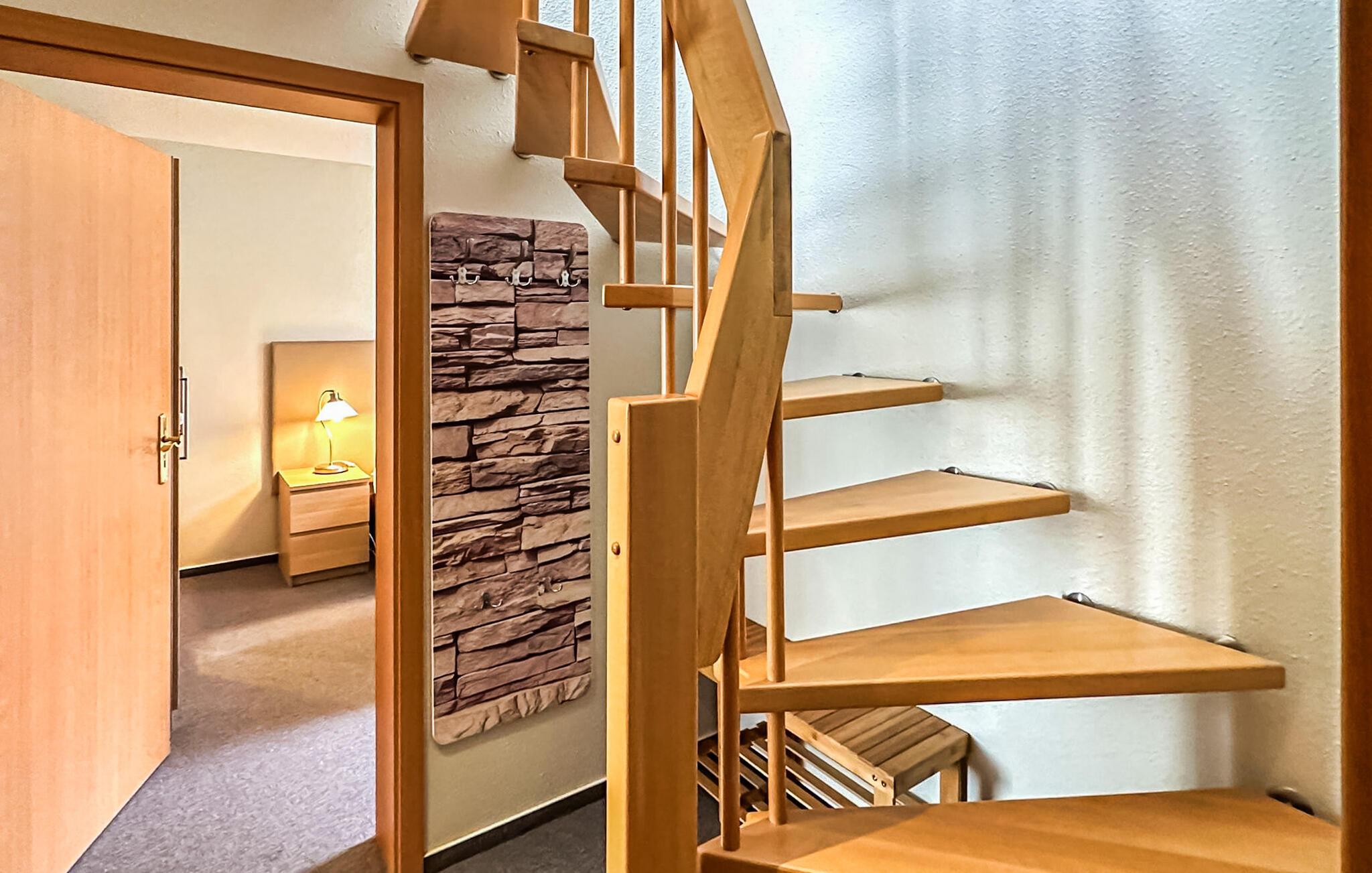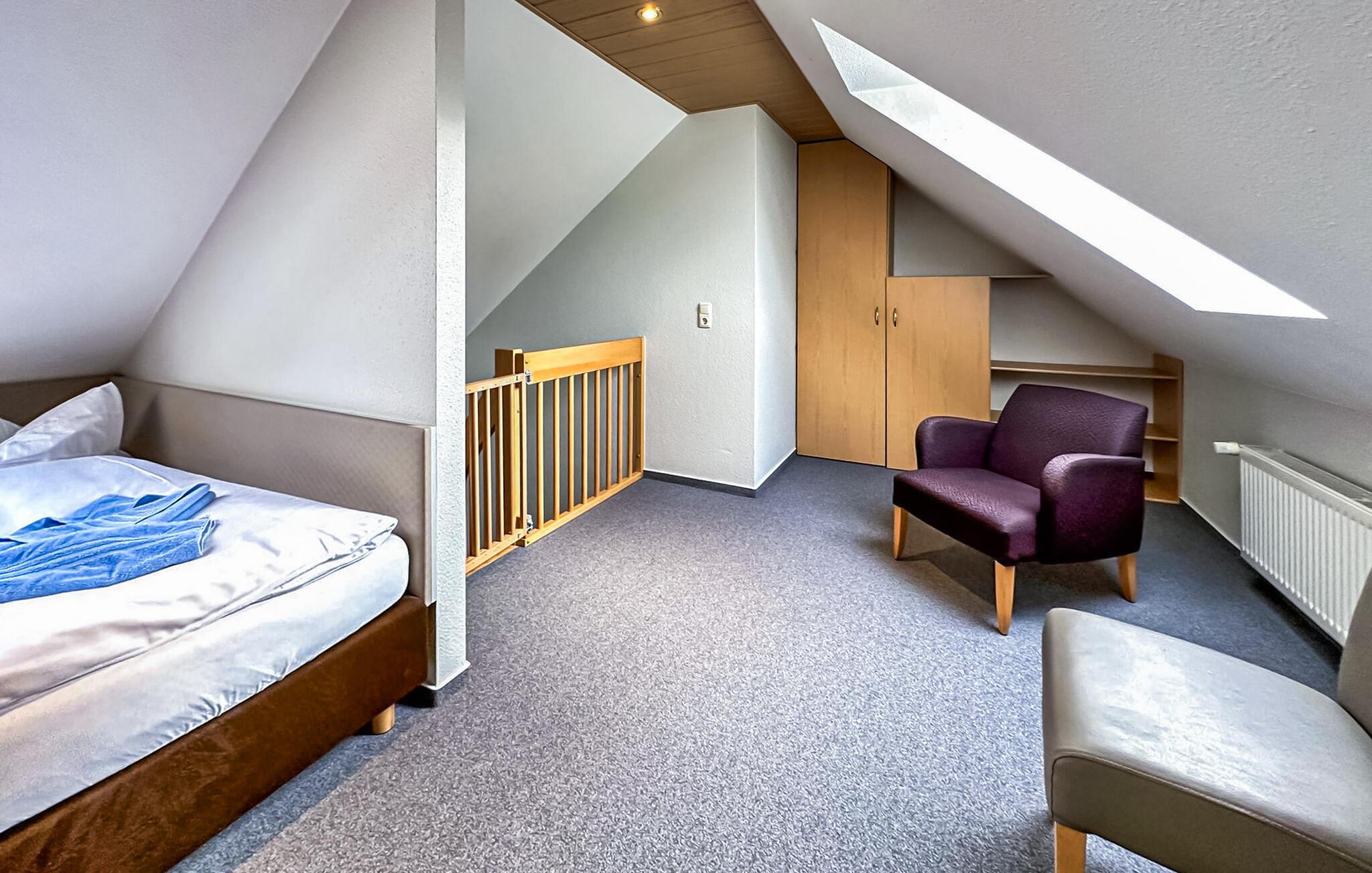 Die 3-Zimmer-Wohnung mit 62 qm für 4 Personen liegt im Ober- bzw. Dachgeschoss und ist über eine zentrale Treppe erreichbar. Es verfügt über ein Wohnzimmer mit Esstisch und offener Küchenzeile (Polstermöbel, Flachbild-TV, Esstisch, Elektroherd, Backofen, Kühlschrank mit Gefrierfach, Mikrowelle, diverse Küchengeräte), ein Badezimmer mit Dusche/WC und ein Schlafzimmer mit Doppelbett (Durchgangszimmer zum Badezimmer). Über eine platzsparende Treppe gelangt man in einen weiteren Wohn-/Schlafbereich mit 2 Einzelbetten, TV und Sitzgelegenheit. Es gibt auch einen möblierten Balkon. Für Kleinkinder kann ein Kinderbett und ein Hochstuhl bereitgestellt werden. WLAN ist ebenfalls verfügbar. Für jede Wohnung auf dem Grundstück stehen ein Parkplatz, Fahrradständer und ein zentraler Grillplatz auf dem Nachbargrundstück zur Verfügung.