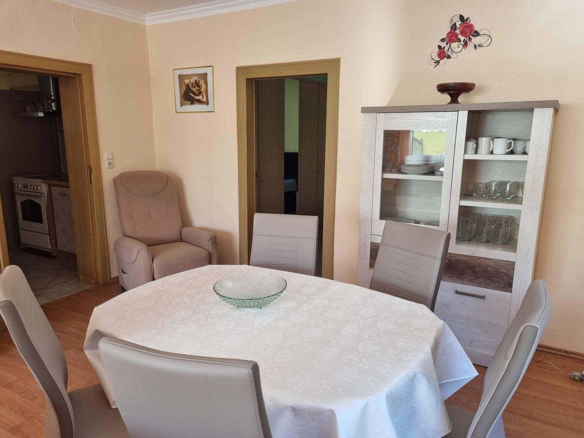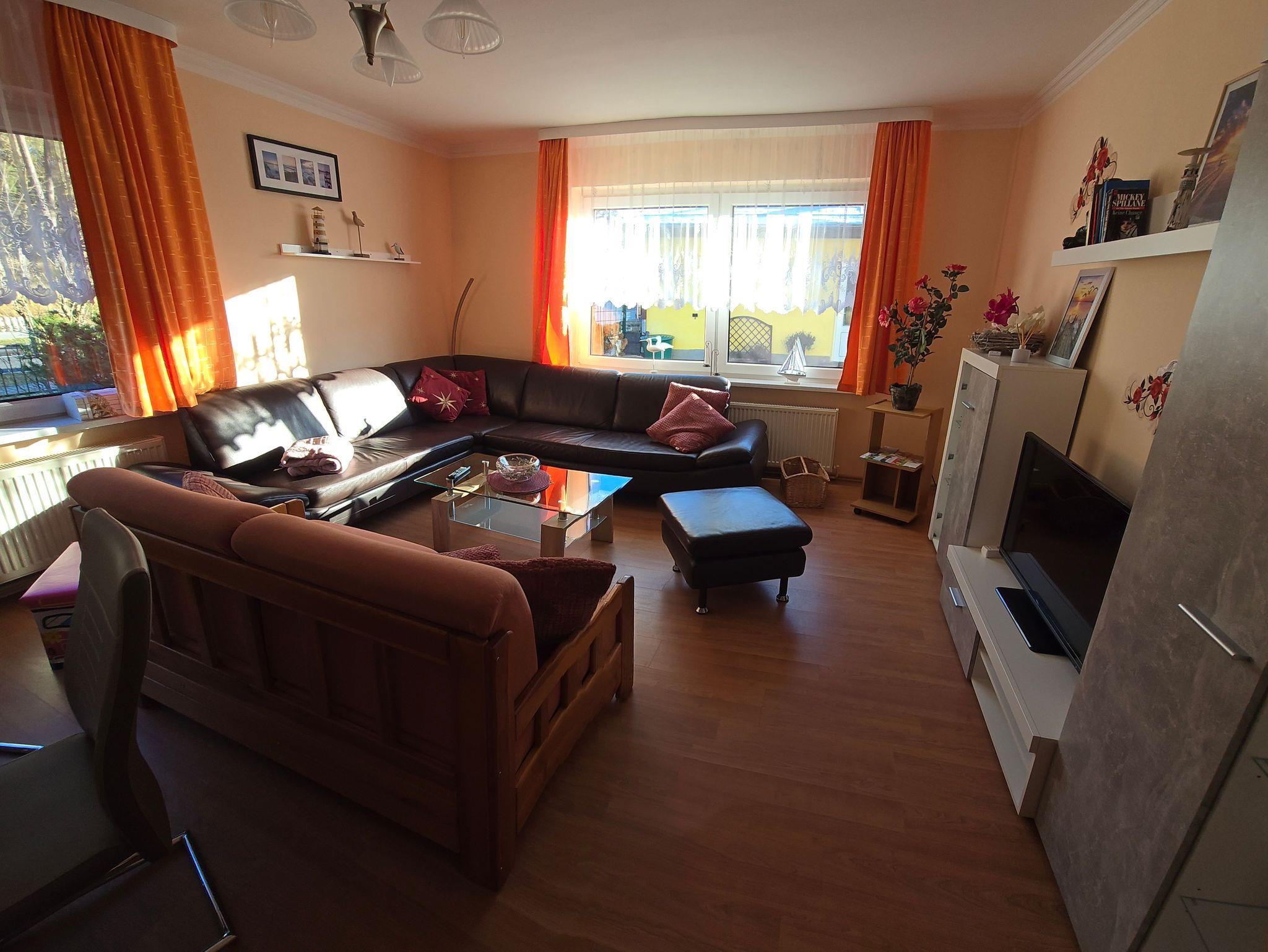 Das Ferienhaus ist mit zwei Schlafräumen, großem Wohnraum, Bad mit Badewanne, Küche mit Essecke, Herd und Backofen ausgestattet.